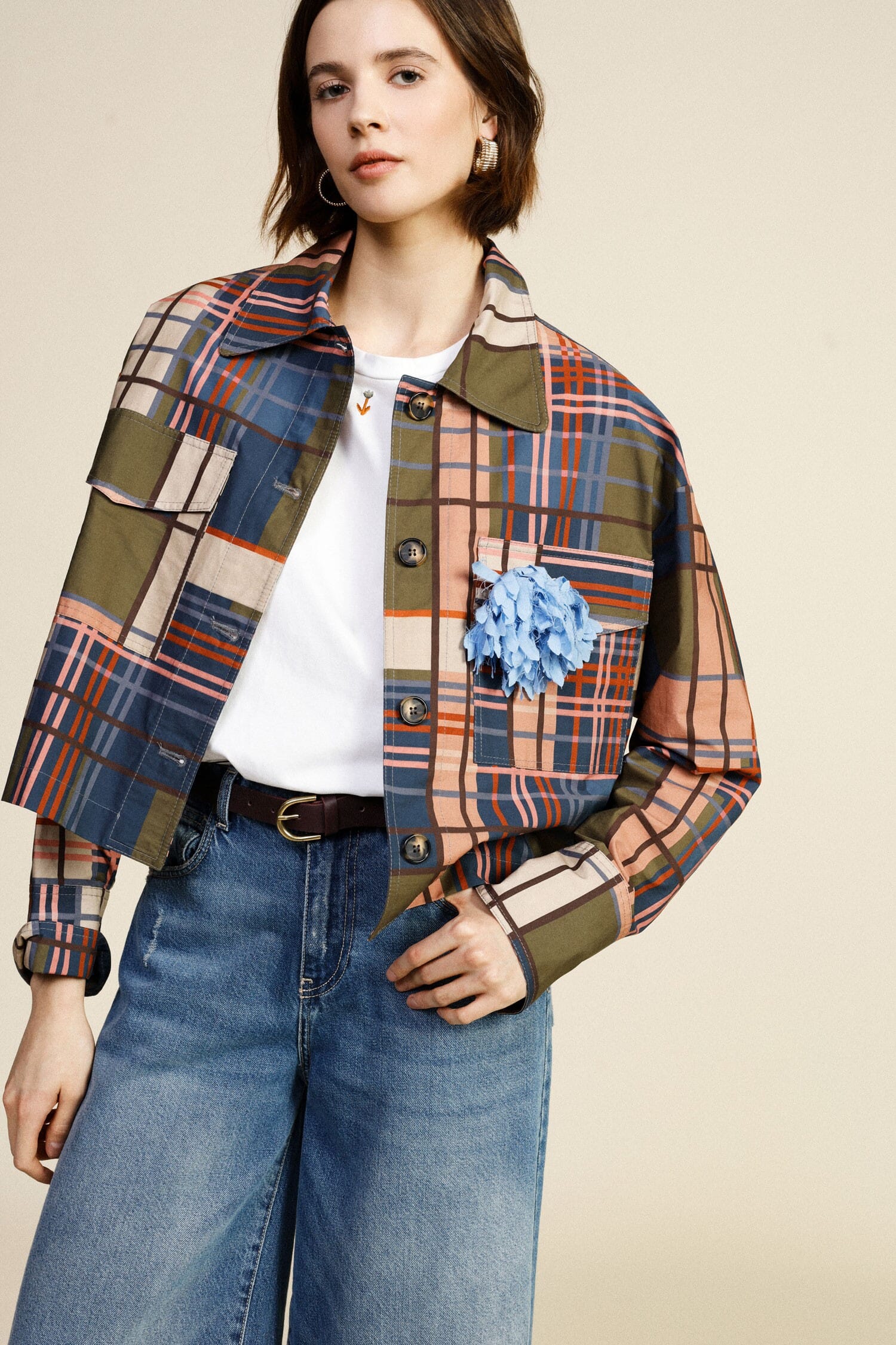 Surprise with a short blazer with a straight fit, embellished with a vibrant plaid print and two patch pockets on the chest. The flower detail on the pocket adds a creative touch and makes you feel instantly unique, perfect for adding character to everyday looks, from going out with friends to more casual moments.