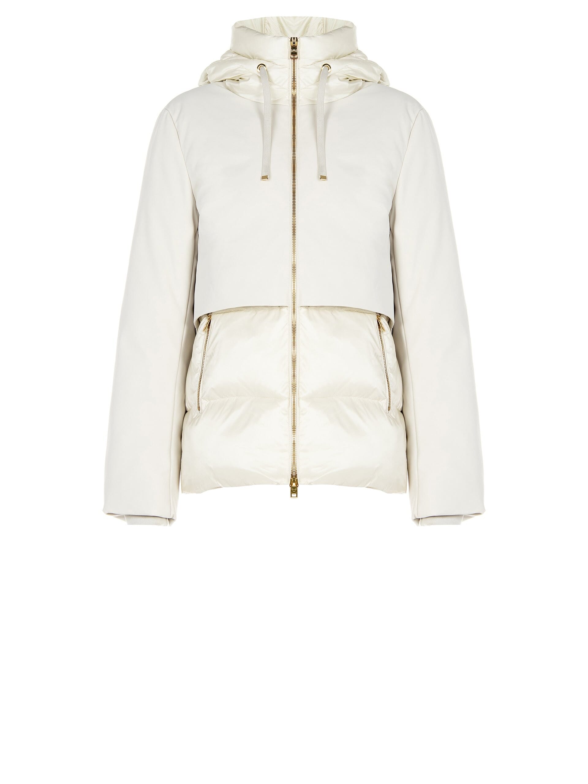 Short outerwear with a soft, feminine fit, finished in smooth technical fabric and quilted padding for light warmth. Wrap-around hood with drawstring and exposed metal zip with zipped pockets. Ideal for city commuting and weekends, it provides protection and freedom of movement with a clean silhouette.