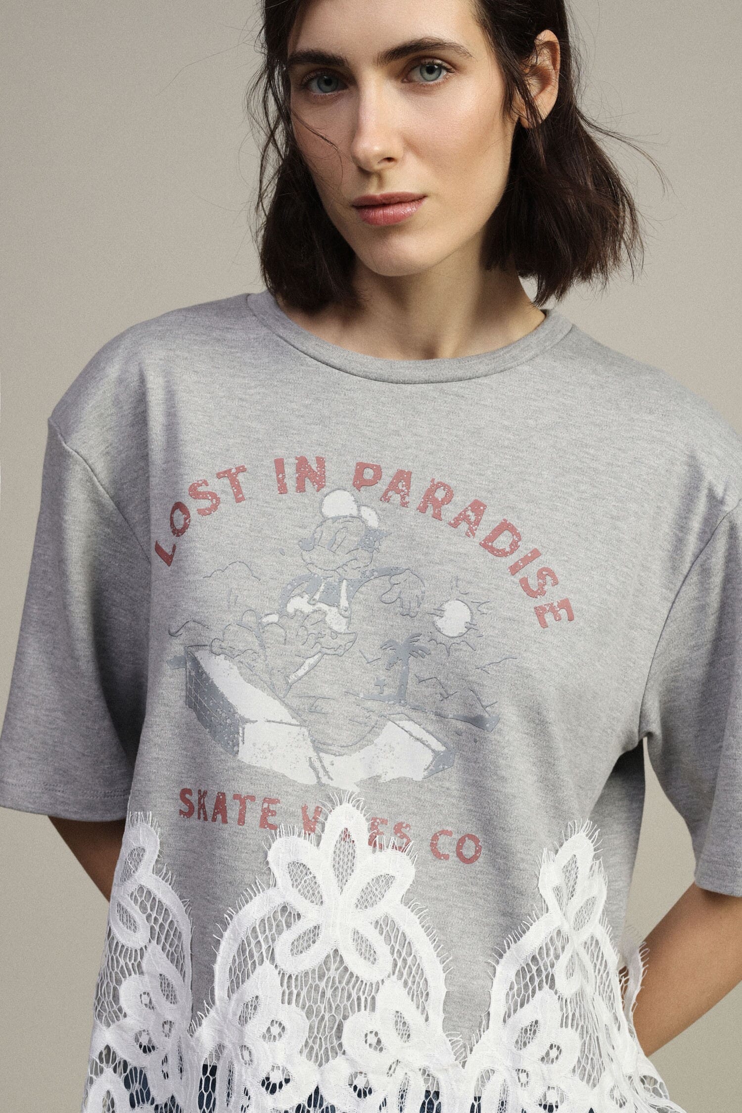 This short-sleeved T-shirt combines a casual style with a romantic touch thanks to the frontal print and the embroidered lace insert on the bottom. Perfect for those who love original details and want to feel comfortable but never mundane in everyday activities.