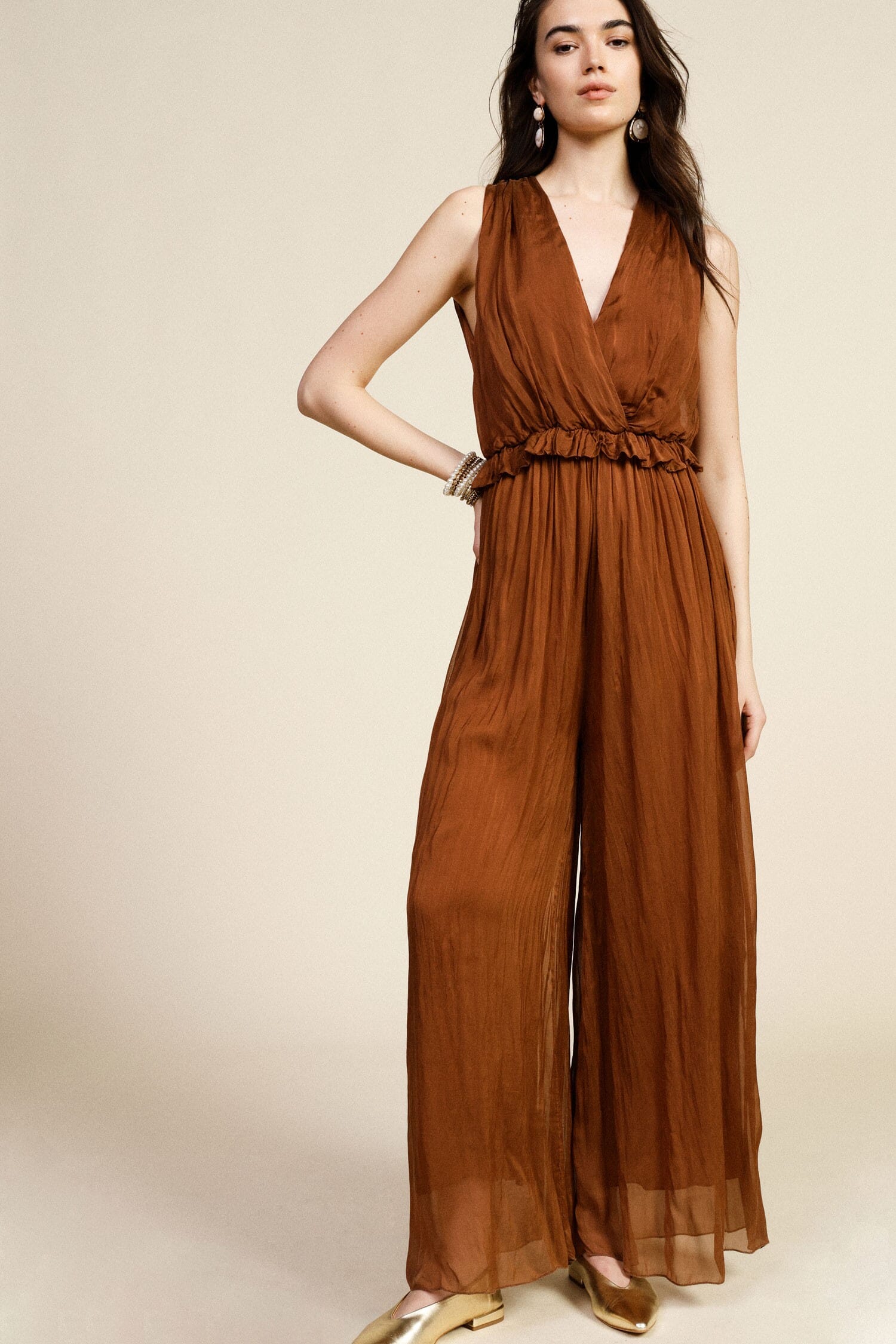 This sleeveless jumpsuit wins you over with its loose, light line, perfect for feeling comfortable all day long. The v-neckline enhances the décolleté while the gathered waist gives movement and practicality. Ideal for feminine and original looks, it is easy to wear for both informal outings and special occasions.