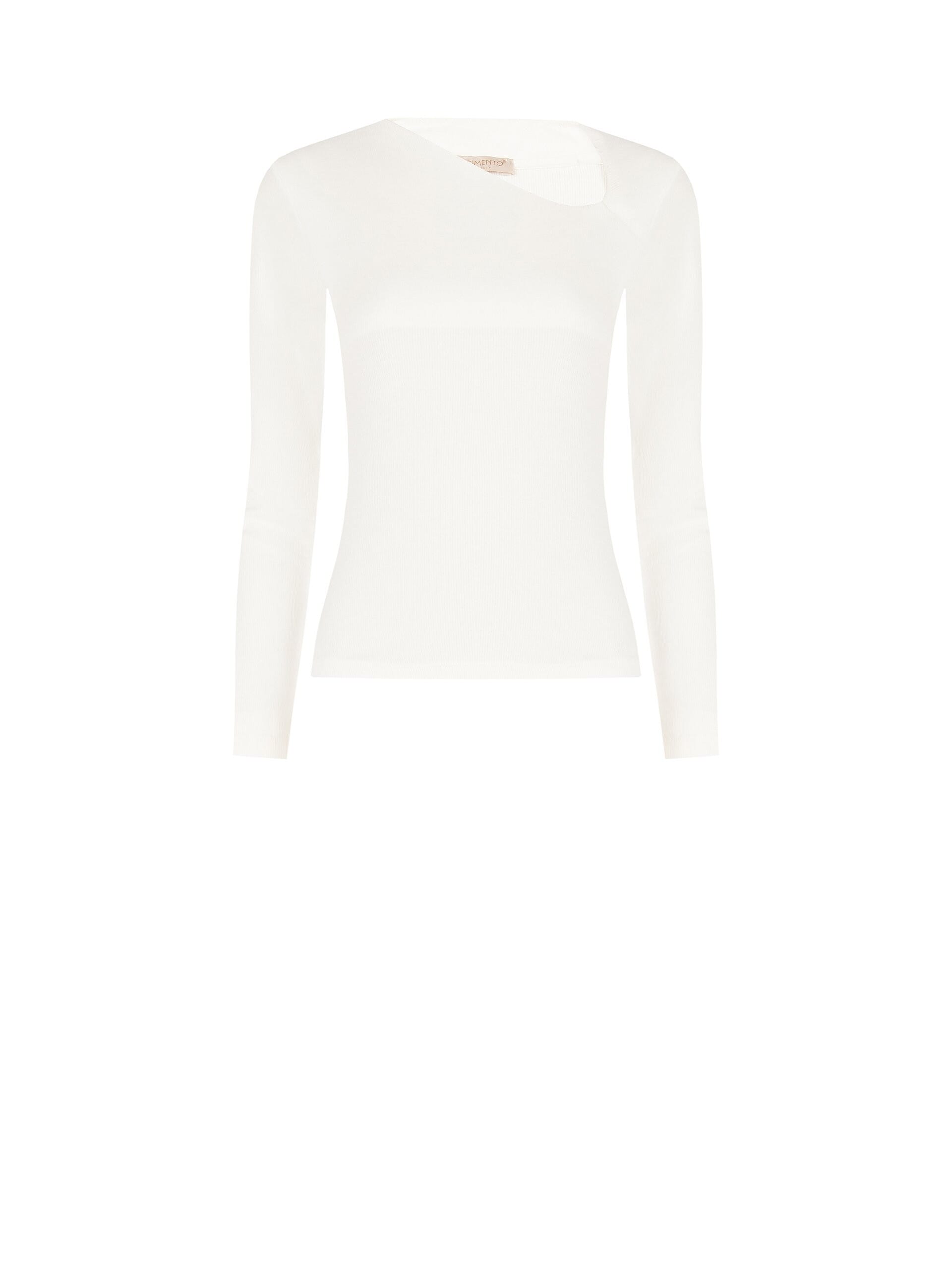 Close-fitting knit in a soft, fine-ribbed cotton blend that hugs the silhouette with comfort. The asymmetrical neckline enhances the shoulders and adds a contemporary touch. Perfect with tailored trousers for the office or with denim for drinks.