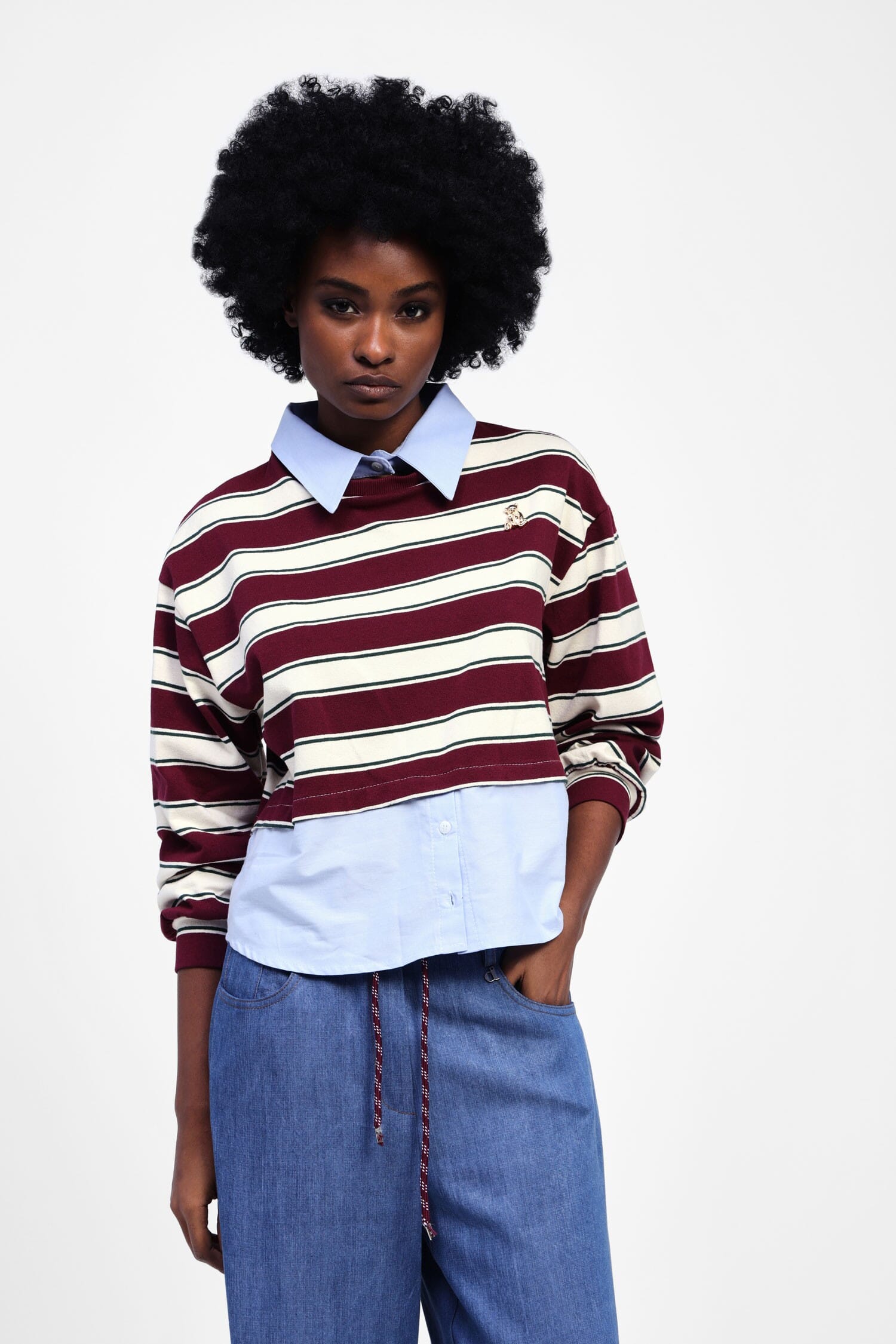 Striped sweatshirt with collar A sweatshirt that blends the elegance of stripes with the originality of the collar. Perfect for those who love to stand out with unique details, it is ideal for creating sophisticated and casual chic looks. Match it with trousers or skirts to express your creative and unconventional personality.