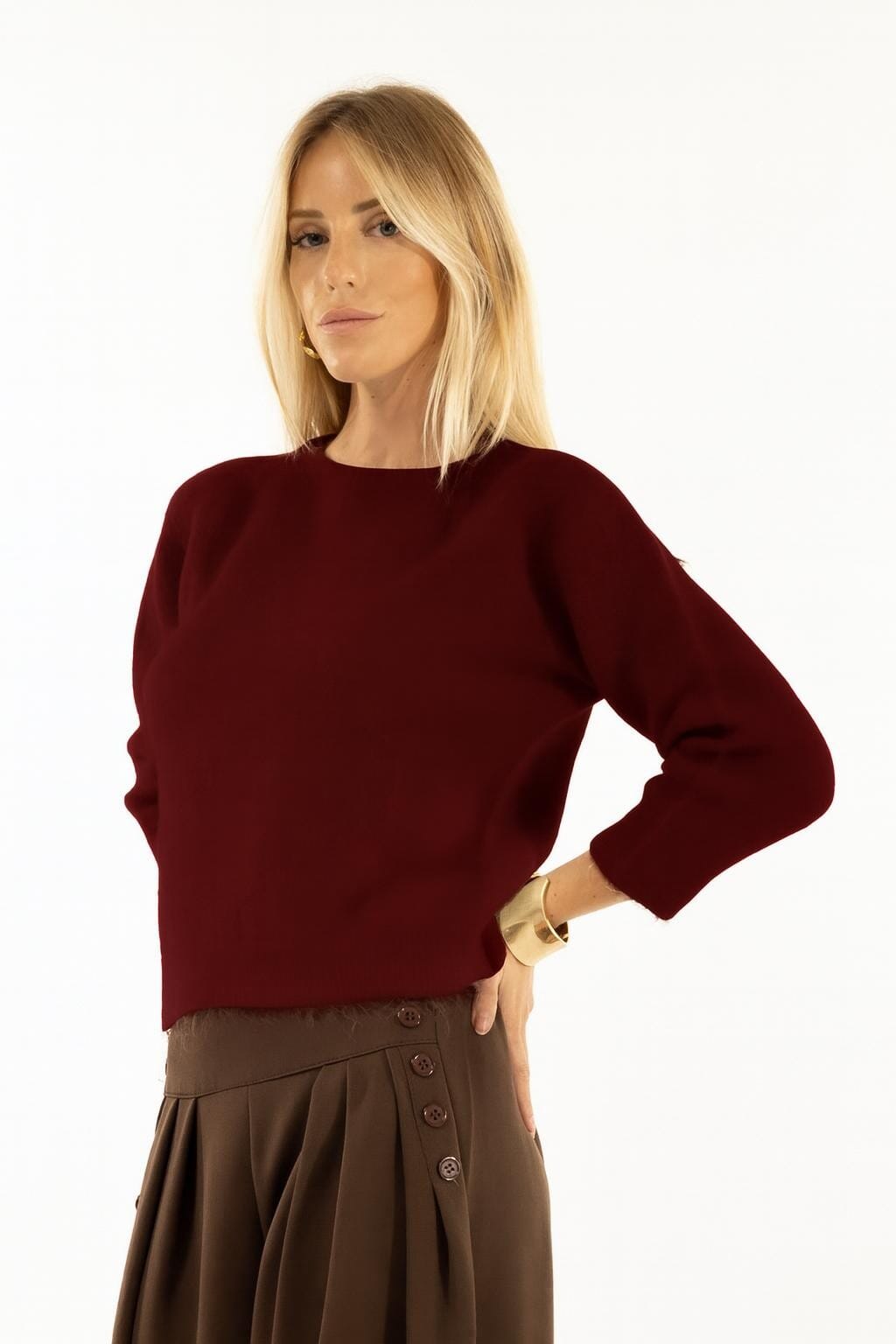 Kontatto jumper with a soft and slightly short fit, snug but light. Soft yarn with a hairy hand and ribbed edges to define the silhouette. Three-quarter sleeves and a clean neckline, perfect under blazers or over high-waisted skirts. Ideal for office and everyday wear with comfort without sacrificing style.