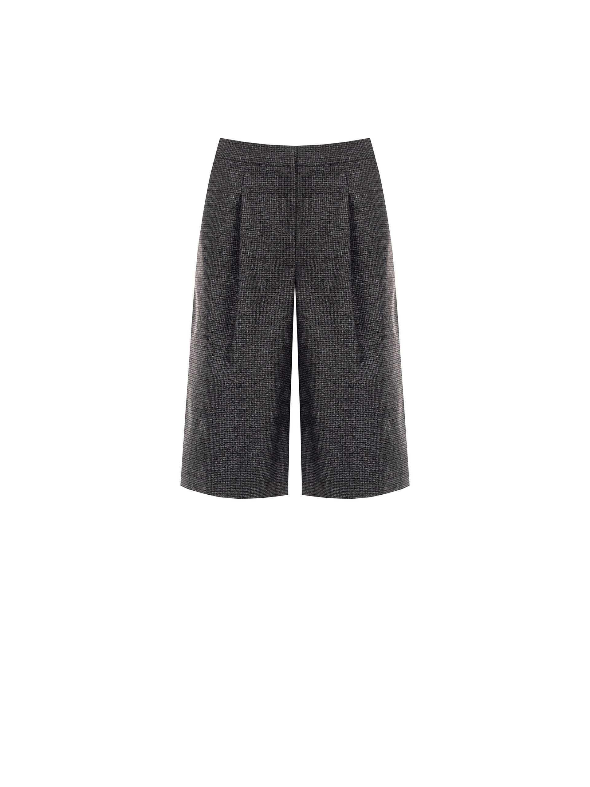 Short tailleur à taille moyenne, coupe souple et jambe large qui affine la silhouette. Tissu à motif Prince de Galles avec une main compacte et confortable. Les plis sur le devant et les poches latérales définissent la ligne ; fermeture dissimulée pour un look épuré. Parfait pour le bureau et de jour comme de nuit avec un blazer ou un tricot léger.