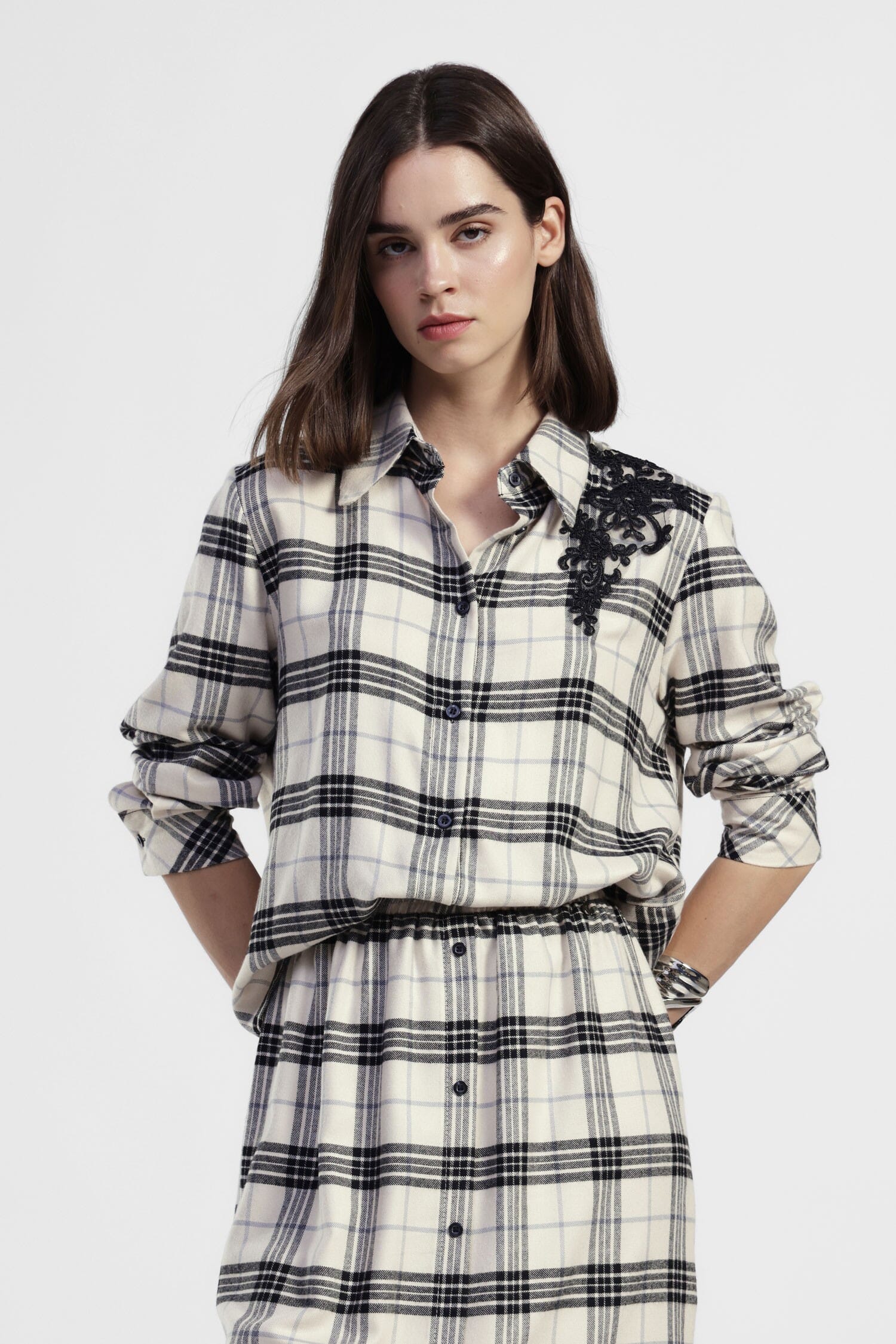 Recréer votre style de tous les jours avec cette chemise à carreaux à coupe droite, agrémentée d'une application florale brodée sur l'épaule. Parfaite pour ajouter une touche de personnalité à vos tenues, elle s'adapte facilement à des looks décontractés ou plus distinctifs. L'ourlet légèrement plus long au dos apporte mouvement et confort.