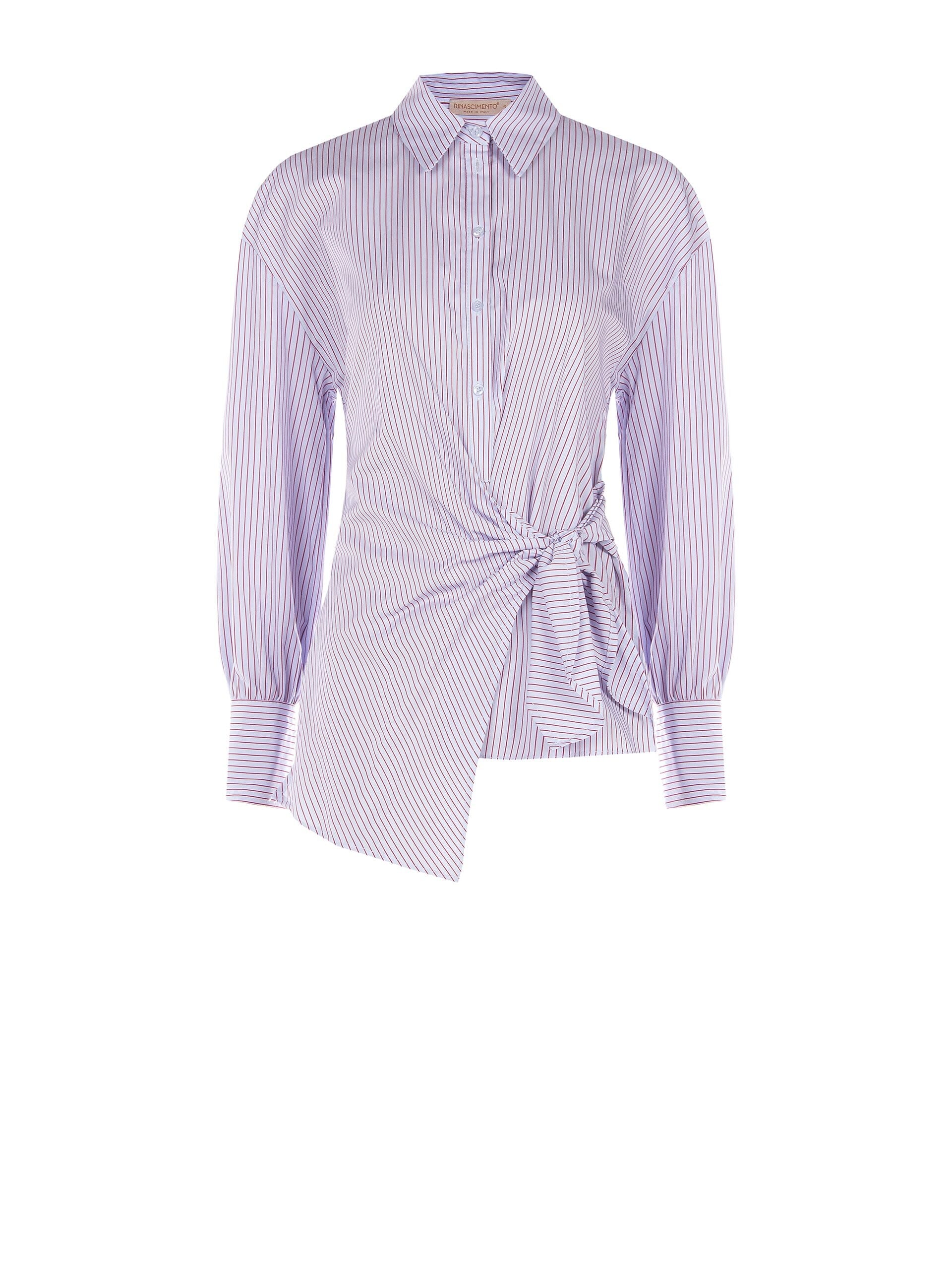 Chemise féminine, cintrée, avec du volume sur les manches. Popeline légère à micro rayures, agréable sur la peau. Cordon de serrage noué à la taille qui sculpte la silhouette et ourlet asymétrique pour une touche de modernité. Col classique et boutonnage sur le devant. Parfait pour le bureau et les apéritifs.