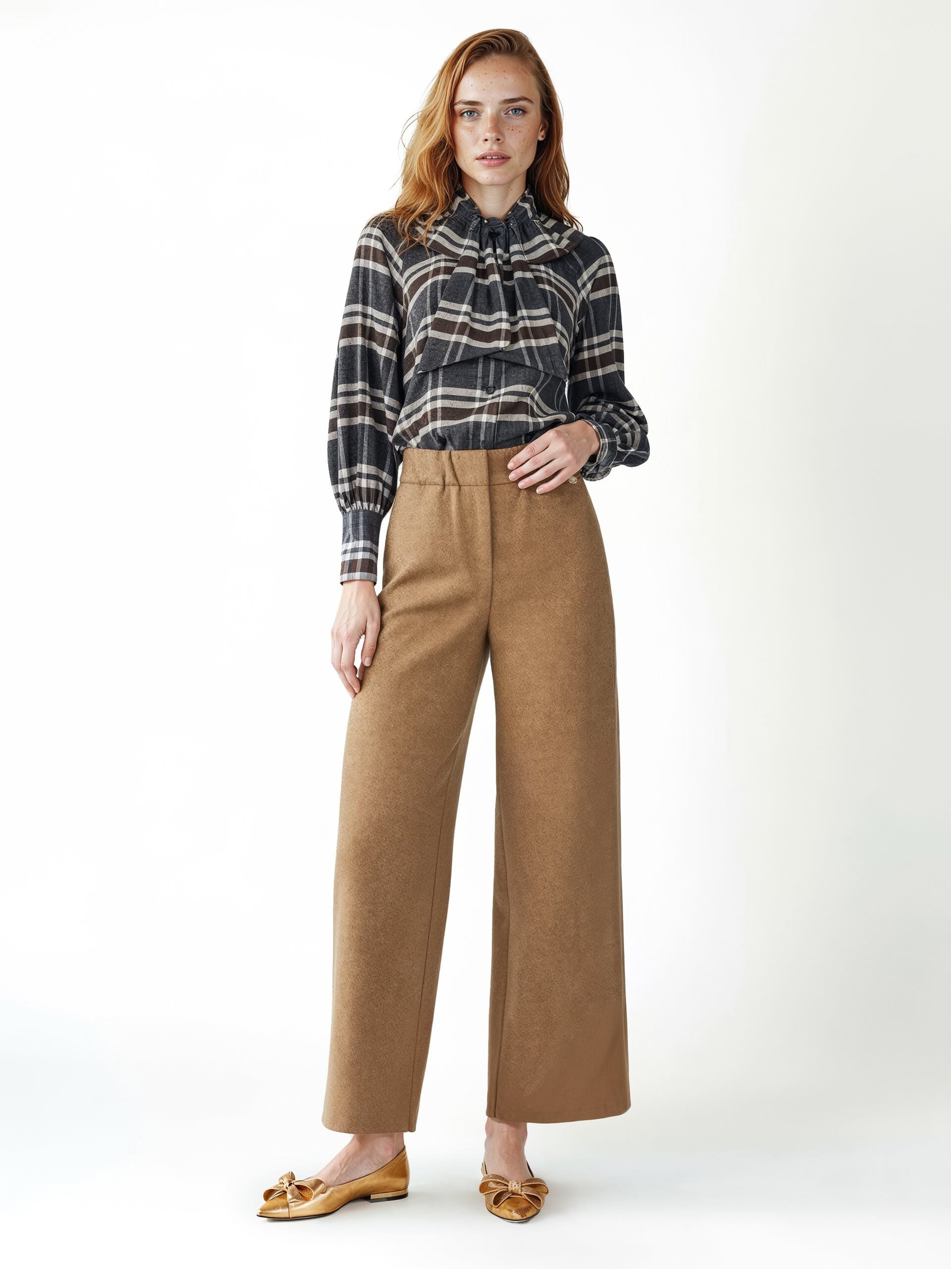 Chemise à la coupe souple qui épouse la silhouette avec confort. Tissu à carreaux effet flanelle, doux et léger. Détails distinctifs : maxi nœud à l'encolure et rabat devant qui crée du mouvement, manches avec poignets froncés. Parfaite pour le bureau avec des costumes, elle est aussi idéale au quotidien sur un jean ou une jupe midi.