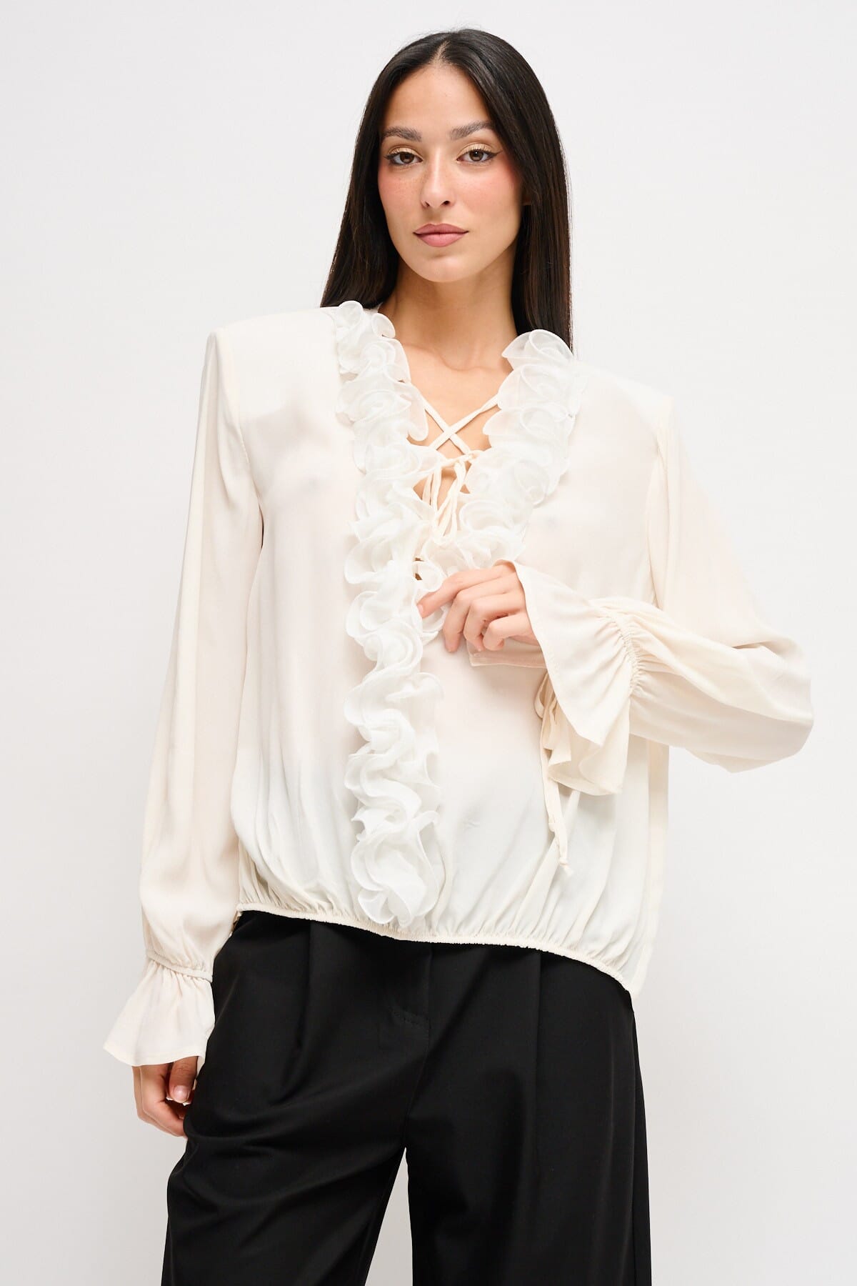 Top Maryley en viscose fluide : coupe souple et bas légèrement froncé qui met en valeur la silhouette sans la comprimer. Main soyeuse, texture légère et fluide. Détails distinctifs : volants et liens au niveau du cou sur le devant, poignets froncés. Parfait du bureau à l'apéritif, facile à assortir et toujours féminin.