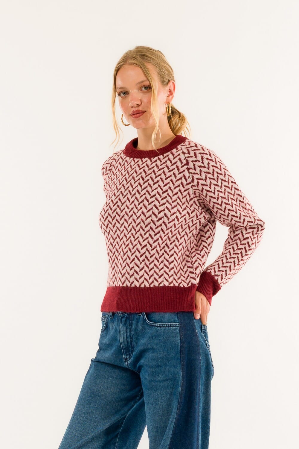 Pull Kontatto à la coupe régulière qui met en valeur la silhouette sans la serrer. Tricot doux avec jacquard à motifs qui donne de la texture et de la chaleur. Encolure ronde et bords côtelés pour une coupe nette. Parfait pour le bureau avec un pantalon de tailleur ou au quotidien avec un jean, il garantit confort et style.