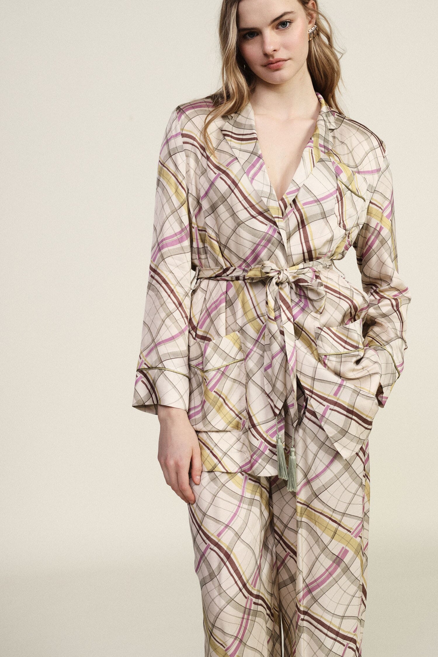 Blazer à carreaux avec ceinture à nouer