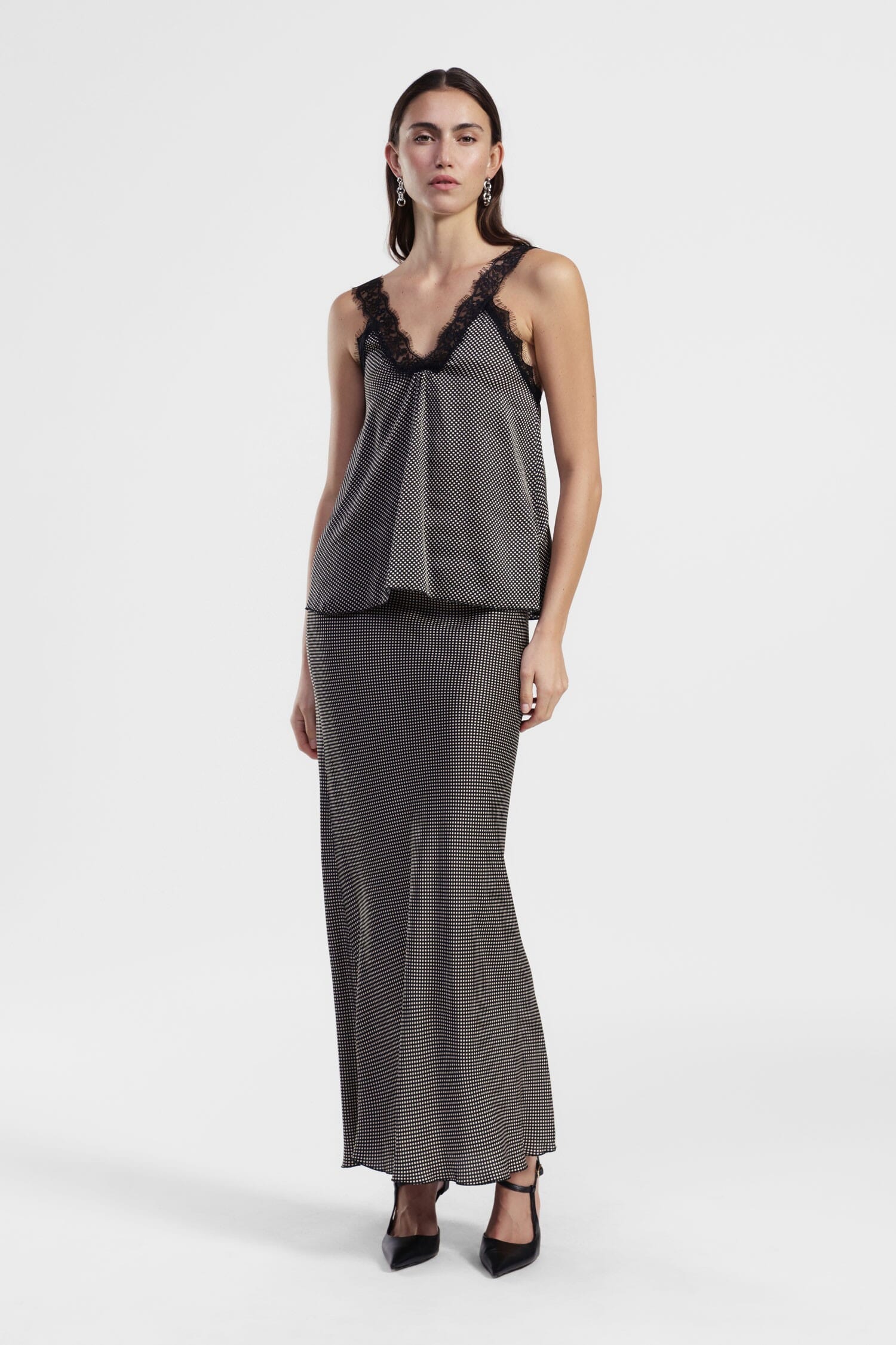 Parfaite pour tous les jours, cette jupe midi évasée offre une coupe fluide qui suit naturellement vos mouvements. Le motif pied-de-poule micro lui confère une touche sophistiquée et permet de l'associer facilement à des t-shirts comme à des pulls. Imaginez-la pour une promenade en ville ou pour une journée au bureau avec toute votre personnalité.