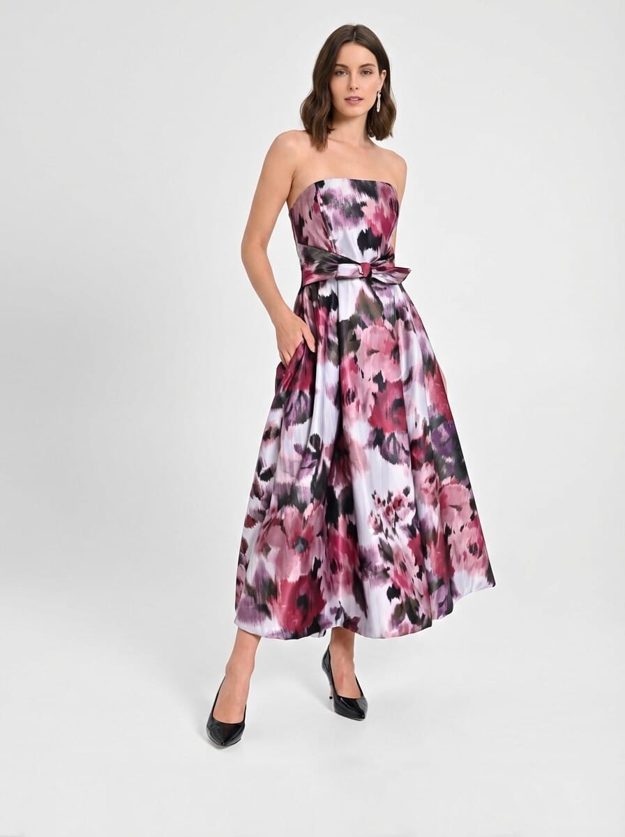 Robe midi à la ligne évasée qui souligne la taille et donne du mouvement. Réalisée en satin duchesse structuré, lisse et lumineux. Corsage à encolure droite et fines bretelles, nœud à la taille et poches latérales pratiques. Parfaite pour les cérémonies et les fêtes, elle garantit élégance et confort tout au long de la soirée.