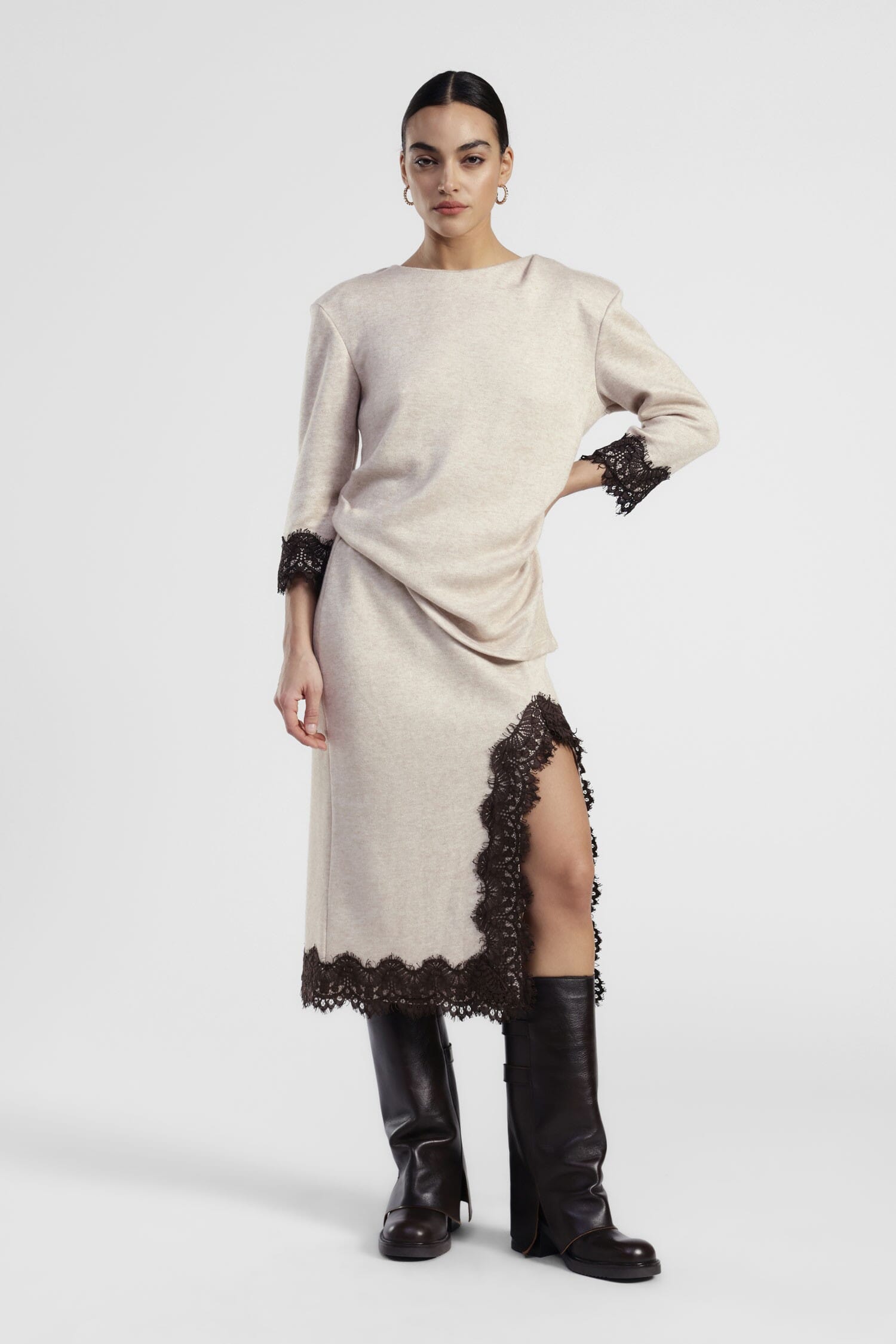 Laissez-vous séduire par cette jupe midi féminine, agrémentée d'un empiècement en dentelle raffiné qui suit l'ourlet et la fente latérale. Parfaite pour toutes les occasions où l'on veut se sentir spéciale mais toujours à l'aise, elle met en valeur la silhouette grâce à sa taille haute et à sa coupe droite, facile à associer à des bottes hautes ou des escarpins.