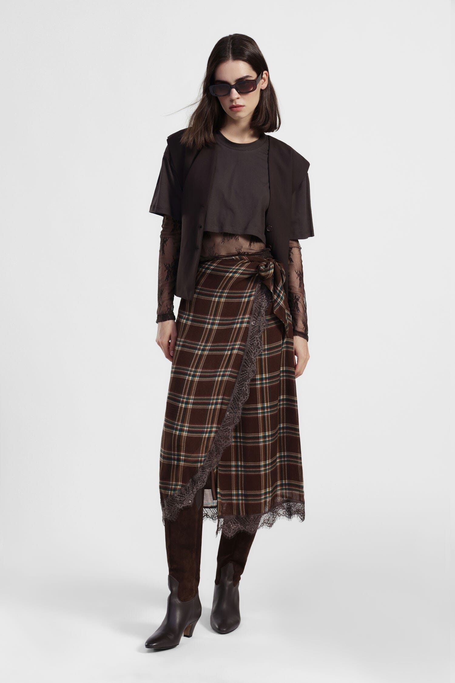 Jupe portefeuille à carreaux avec bordures en dentelle