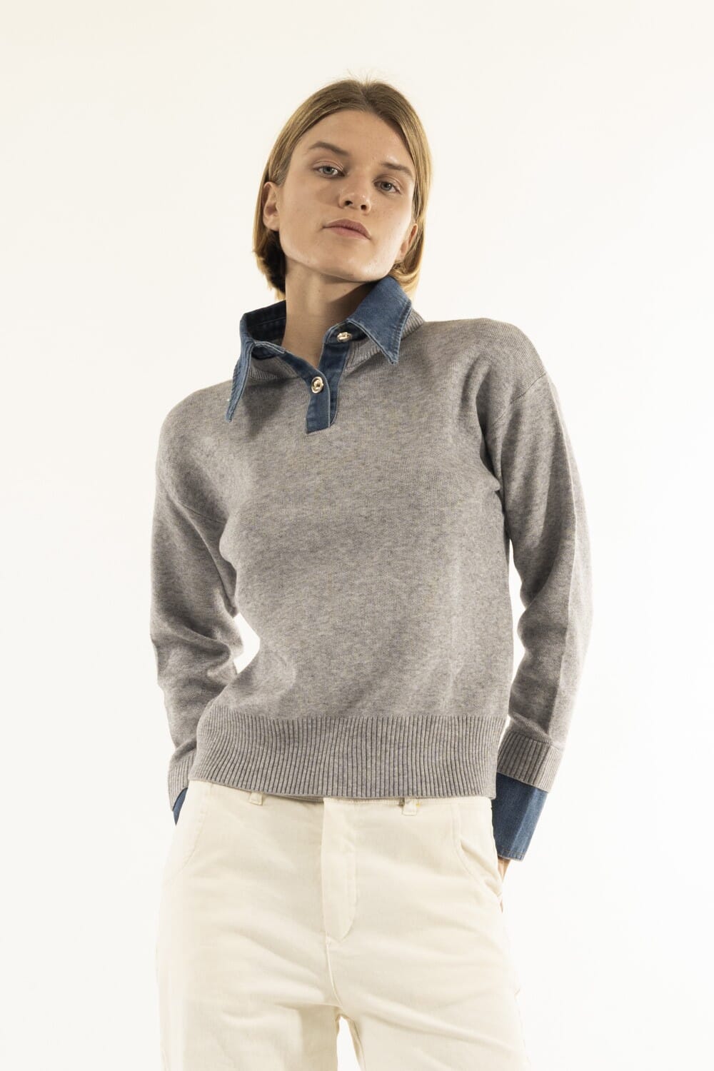 Pull à la coupe droite et confortable en maille douce avec une texture fine. Le col et les poignets effet chemise en denim, avec boutonnage bijou, donnent du caractère et de la praticité. Bordure côtelée qui met en valeur la silhouette. Parfait pour le bureau et le quotidien, facile à associer et idéal pour les superpositions. Marque : Kontatto.