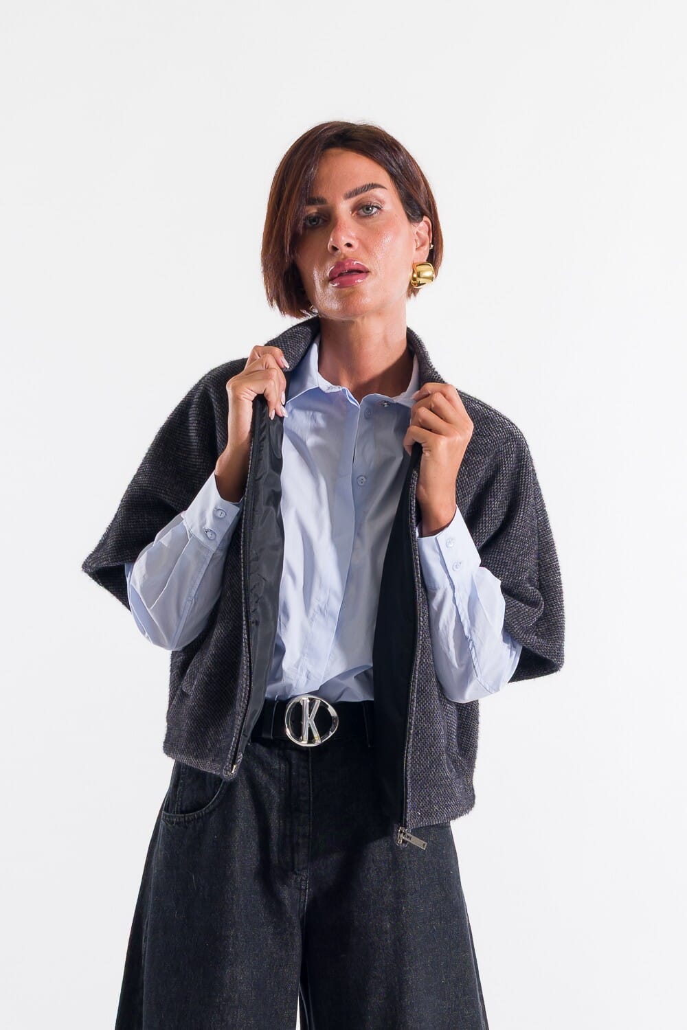 Kontatto signe une micro-casquette à la coupe souple et légèrement caissonnée, idéale pour les superpositions. Tissu bouclé doux avec intérieur lisse pour un confort quotidien. Col montant et zip frontal sur toute la longueur, manches kimono qui affinent la silhouette. Parfait pour le bureau et les loisirs.