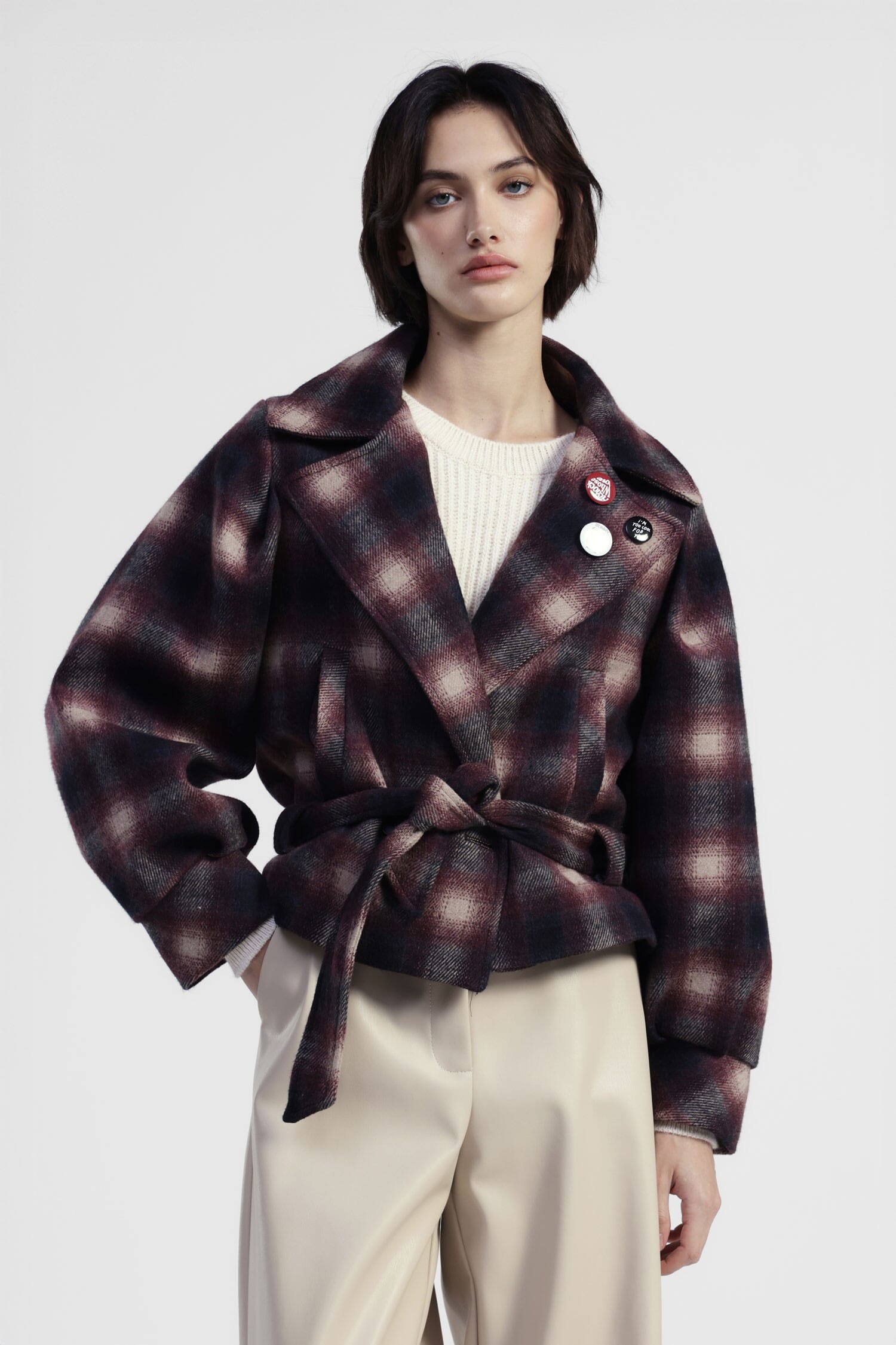 Un manteau court à la ligne souple, rehaussé d'un imprimé à carreaux nuancé et d'une ceinture assortie pour une silhouette toujours polyvalente. Le col large et les épingles décoratives apportent une touche originale et personnelle, idéale pour compléter une tenue de tous les jours avec une touche distinctive.