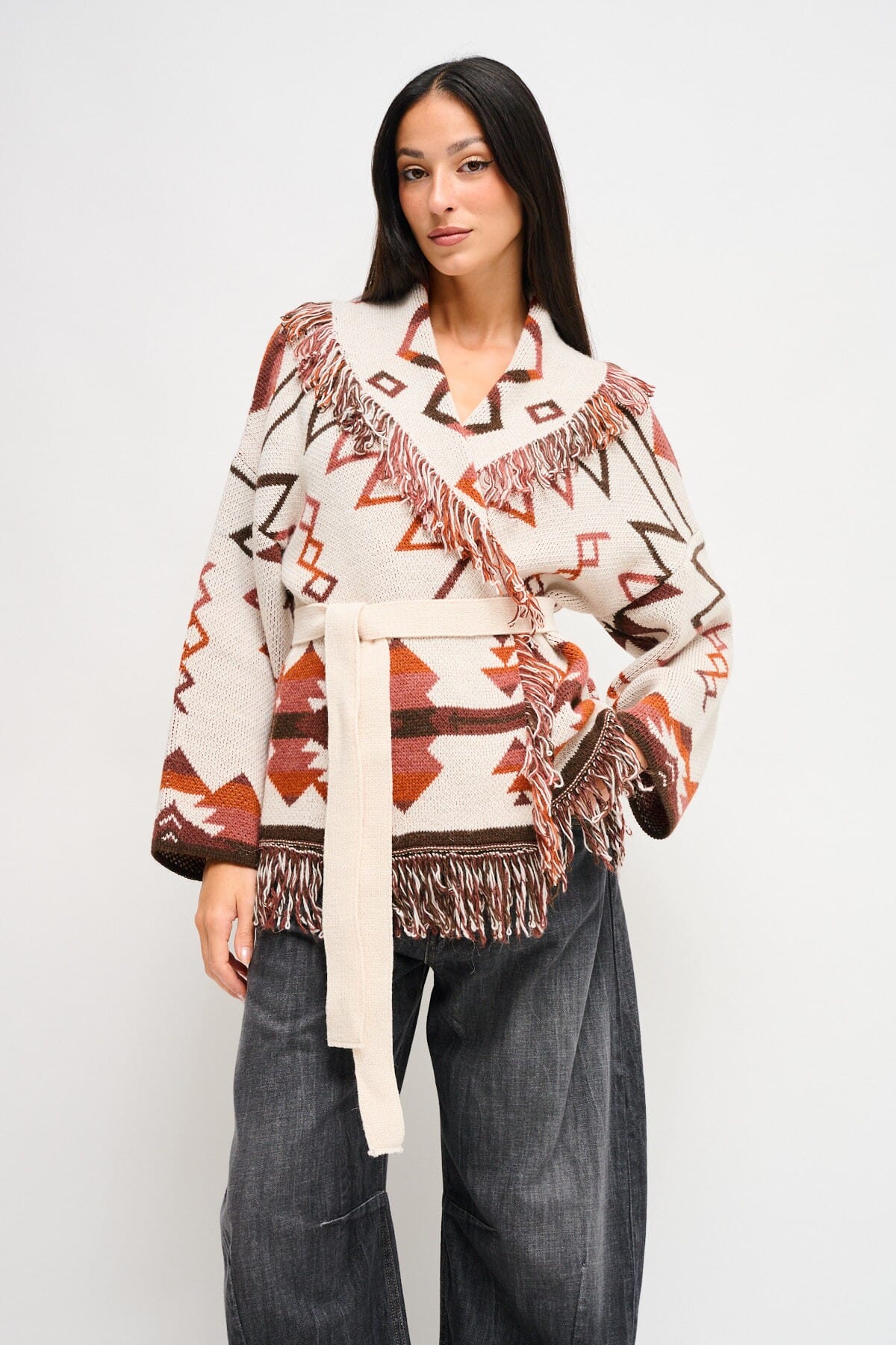 Maryley interprète la maille avec un vêtement doux et enveloppant à la coupe décontractée, ajustable à la taille par une ceinture. Maille jacquard aux mains douces, finie avec des franges sur les revers et le bas. Le col châle et les manches larges mettent en valeur la silhouette. Parfait pour le bureau informel ou pour rehausser le look quotidien.