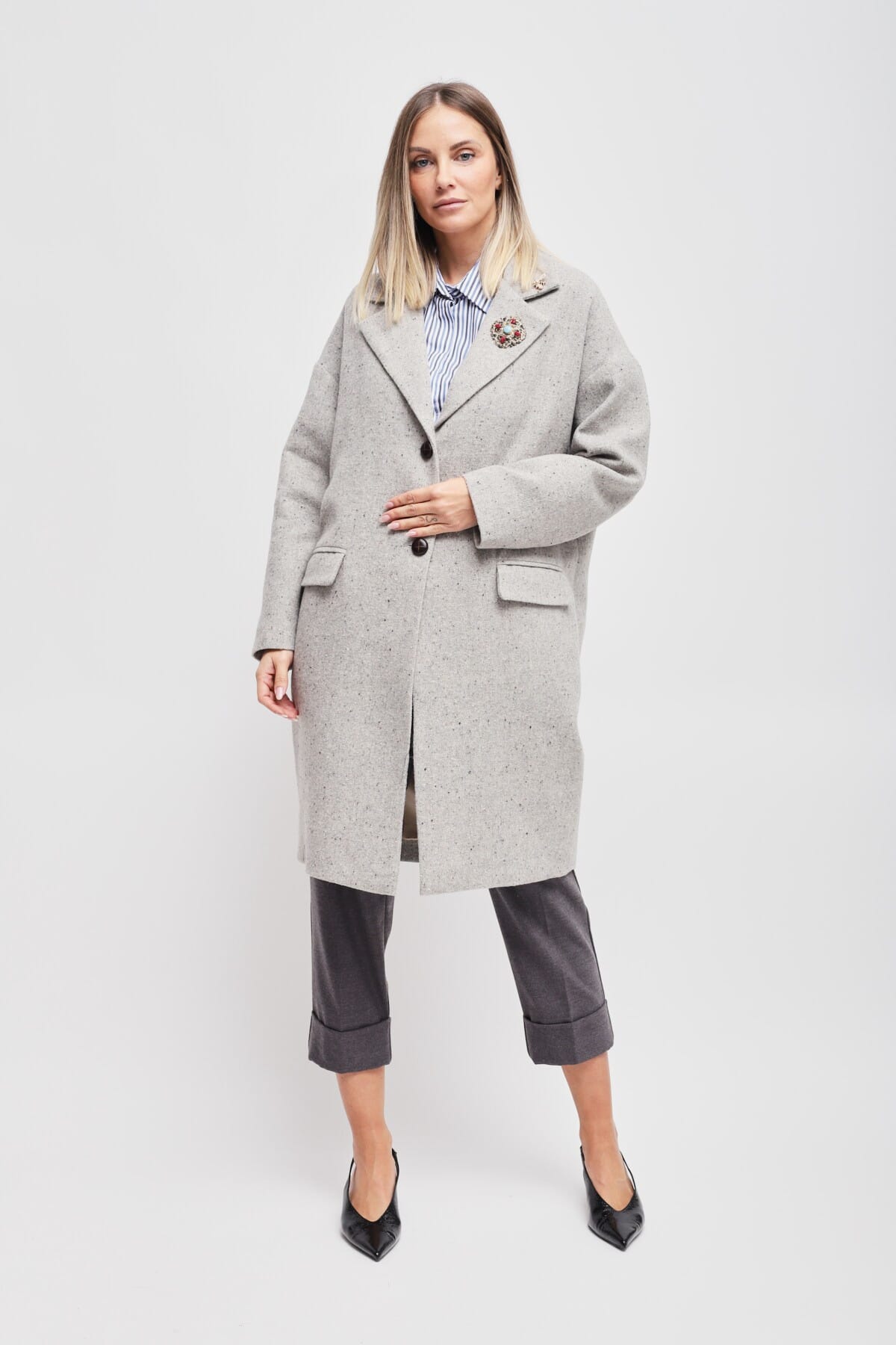 Maryley signe un pardessus à la coupe droite et décontractée, en laine bouclée au toucher doux et chaud. Larges revers, fermeture boutonnée, poches à rabat et broche bijou amovible qui illumine le look. Facile à superposer, il met en valeur la silhouette sans la contraindre. Parfait pour le bureau et le quotidien chic.