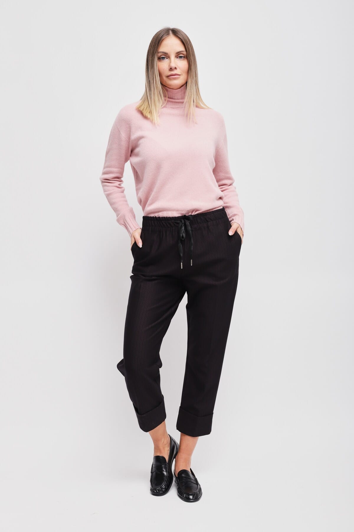 Maryley réinterprète le pantalon décontracté : taille élastiquée avec cordon de serrage pour un confort sur mesure, jambe droite légèrement raccourcie. Matière douce et fluide avec micro-texture, agréable sur la peau. L'ourlet retroussé et les poches latérales définissent la silhouette. Parfait pour le bureau et un quotidien soigné.