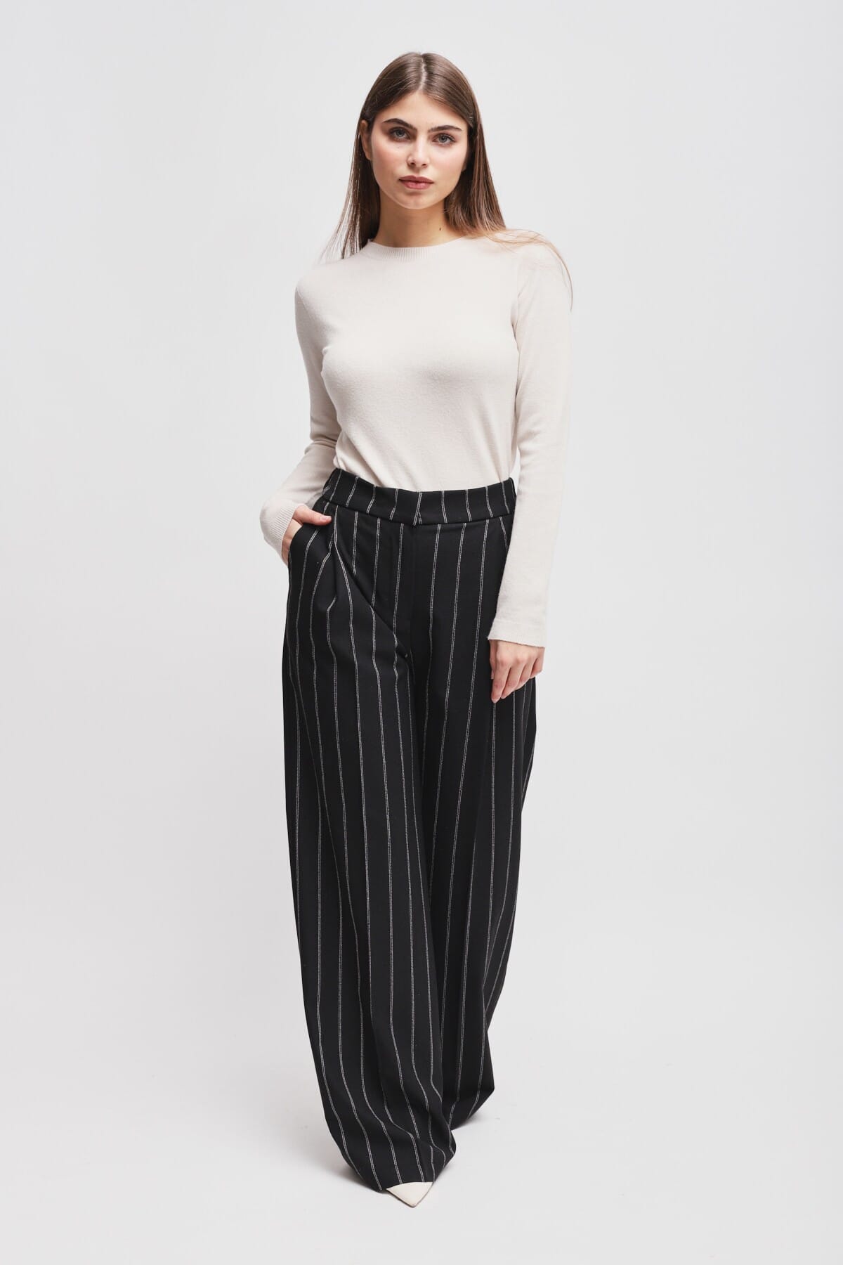Maryley signe un pantalon large à taille haute dont la coupe fluide affine la silhouette. Tissu doux aux rayures subtiles et légèrement satiné pour un confort tout au long de la journée. Les plis sur le devant et les poches latérales définissent la ligne ; fermeture à glissière dissimulée. Parfait pour le bureau et pour un apéritif avec un blazer ou une maille minimale.
