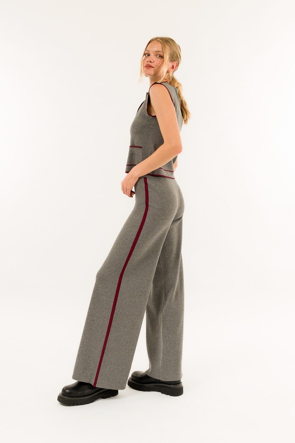 Pantalon à jambes larges avec une coupe souple et une ceinture confortable qui affine la silhouette. Effet tricot compact extensible, agréable sur la peau. Profil latéral et couture de taille contrastés qui définissent les hanches. Polyvalent du bureau au week-end : avec un blazer pour le bureau, avec des baskets pour tous les jours.