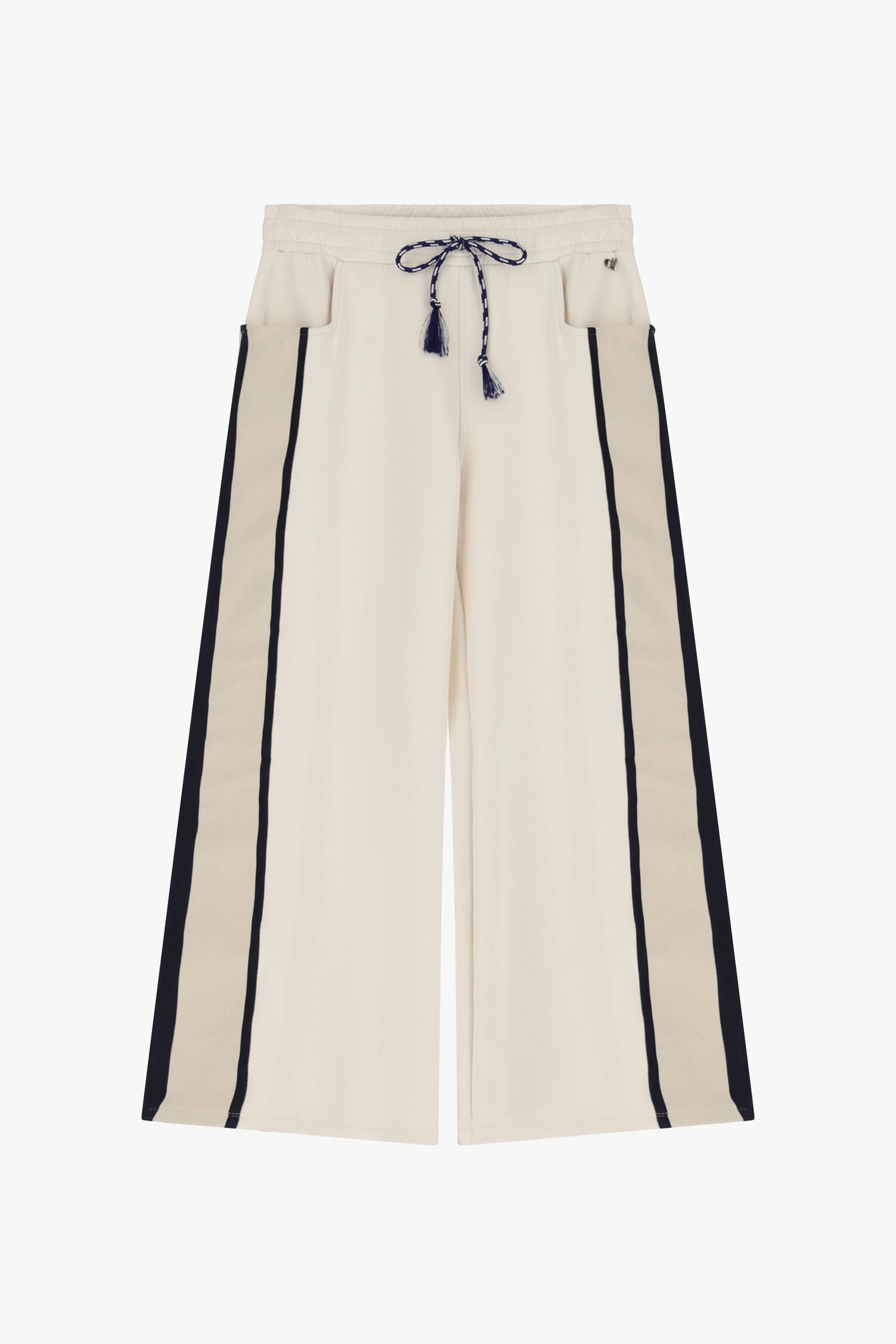 Pantalon ample avec cordon de serrage et bandes latérales Ce pantalon palazzo transforme chaque pas en une ode au style. Avec ses bandes latérales audacieuses et sa taille à cordon chic, il offre un mélange parfait de confort et d'originalité. Idéal pour les femmes à la recherche d'un look non conventionnel, ce pantalon à jambe large apporte mouvement et grâce à chaque tenue.