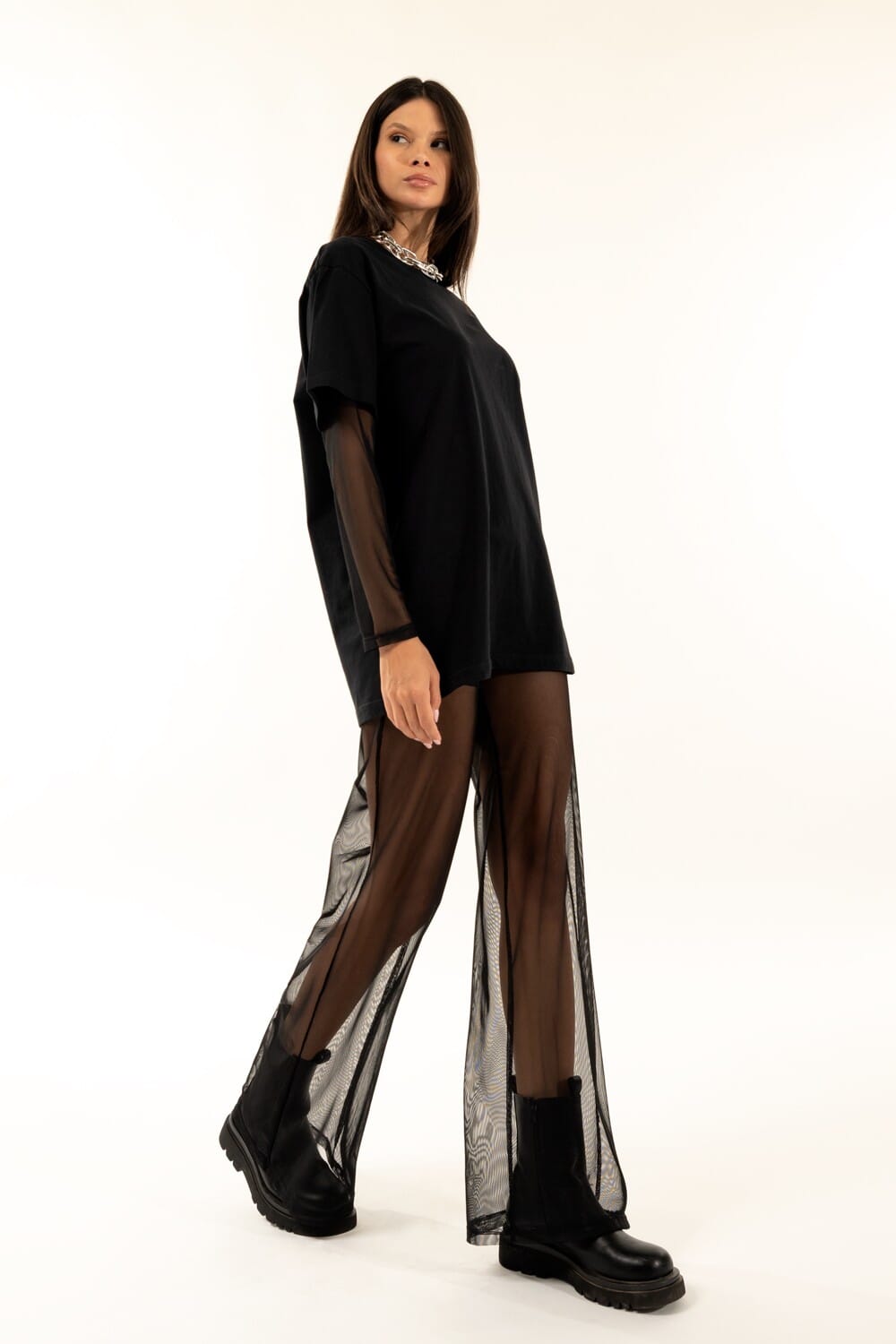 Kontatto signe un pantalon à la coupe souple et à la jambe large, avec des cuissardes internes qui rehaussent la silhouette. Réalisé en tulle léger et fluide, il offre des transparences sophistiquées. Taille élastiquée pour le confort, bas évasé pour l'élan. Parfait pour les fêtes et les cocktails, à associer avec un blazer ou un top basique.