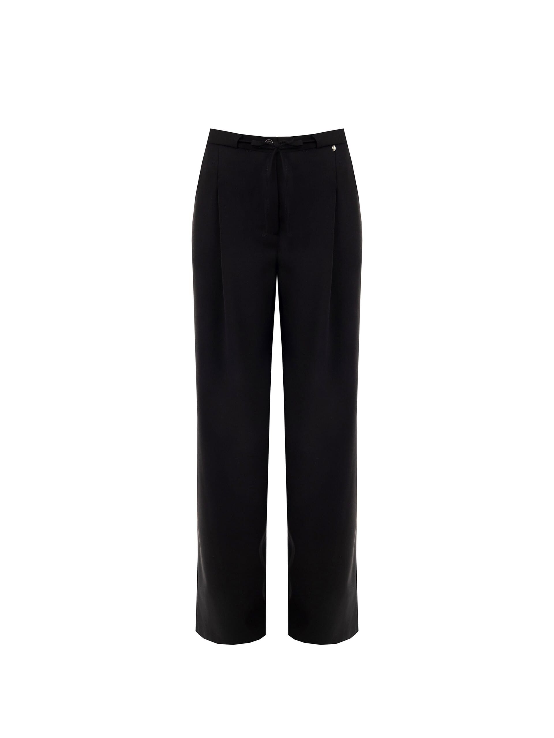 Rinascimento signe un modèle à jambe droite et taille moyenne avec une coupe souple qui amincit sans serrer. Fluidité crêpe avec une touche de stretch pour un confort quotidien. Détails : nœud subtil à la taille et plis extensibles qui définissent la silhouette. Parfait pour le bureau, prêt à partir avec un changement de haut.