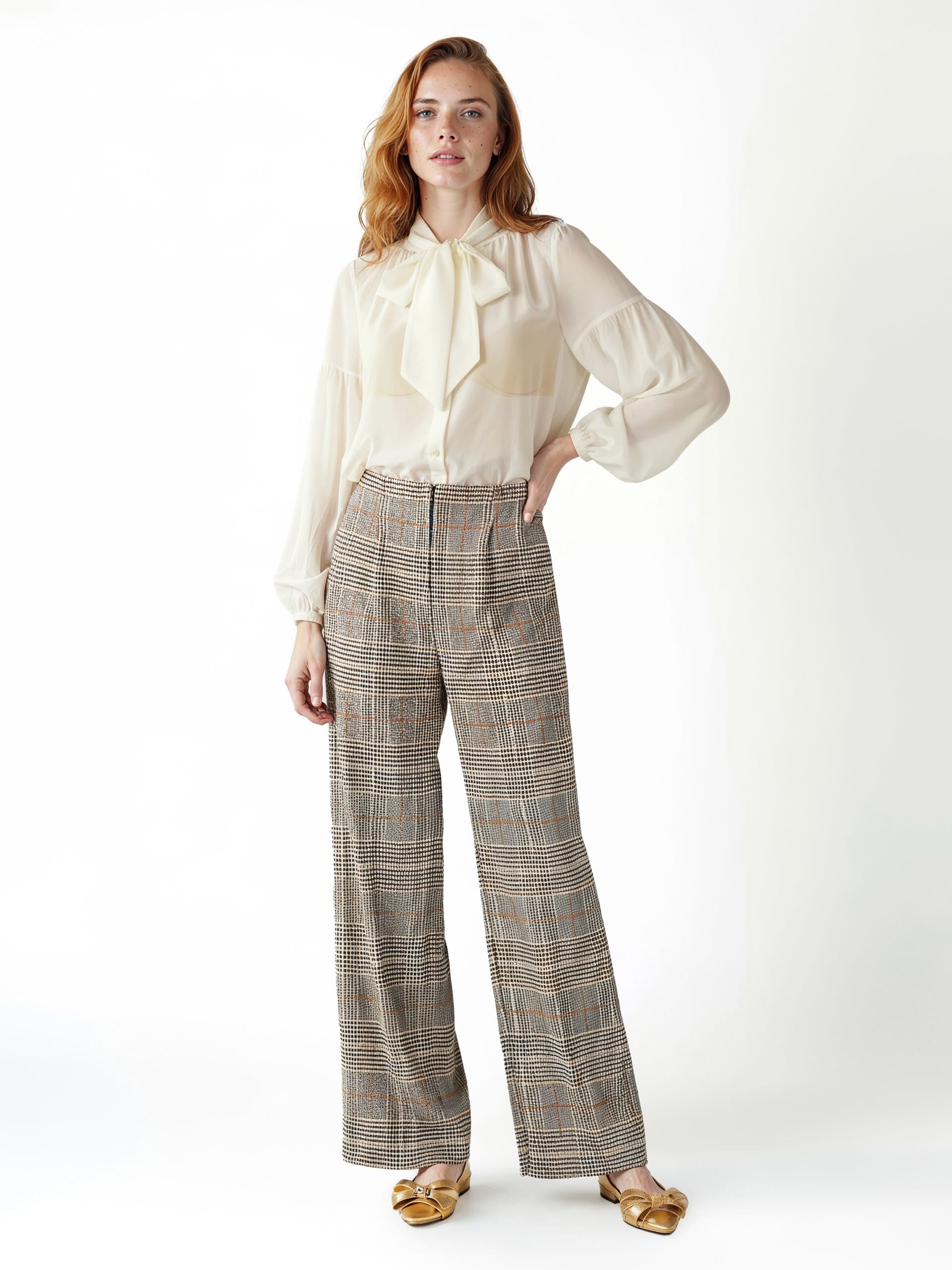 Pantalon Rinascimento à la coupe droite et décontractée qui affine la silhouette sans la serrer. Tissu doux à effet laine avec motif à carreaux. Taille moyenne avec pinces sur le devant et fermeture dissimulée pour une ligne épurée ; poches latérales pour plus de praticité. Parfait au bureau et pour des looks quotidiens raffinés.
