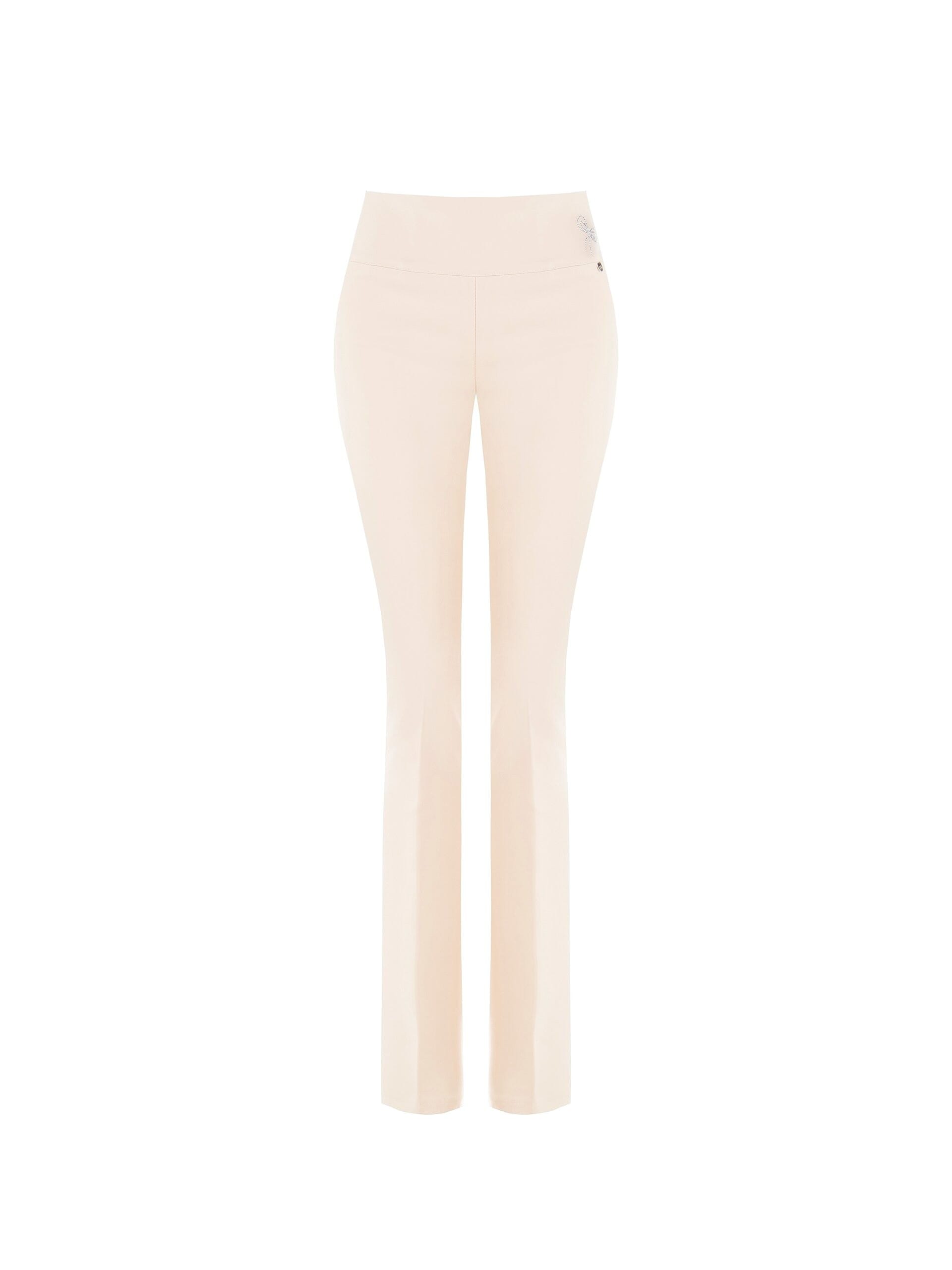 Pantalon skinny évasé en tissu technique avec nœud en strass à la taille