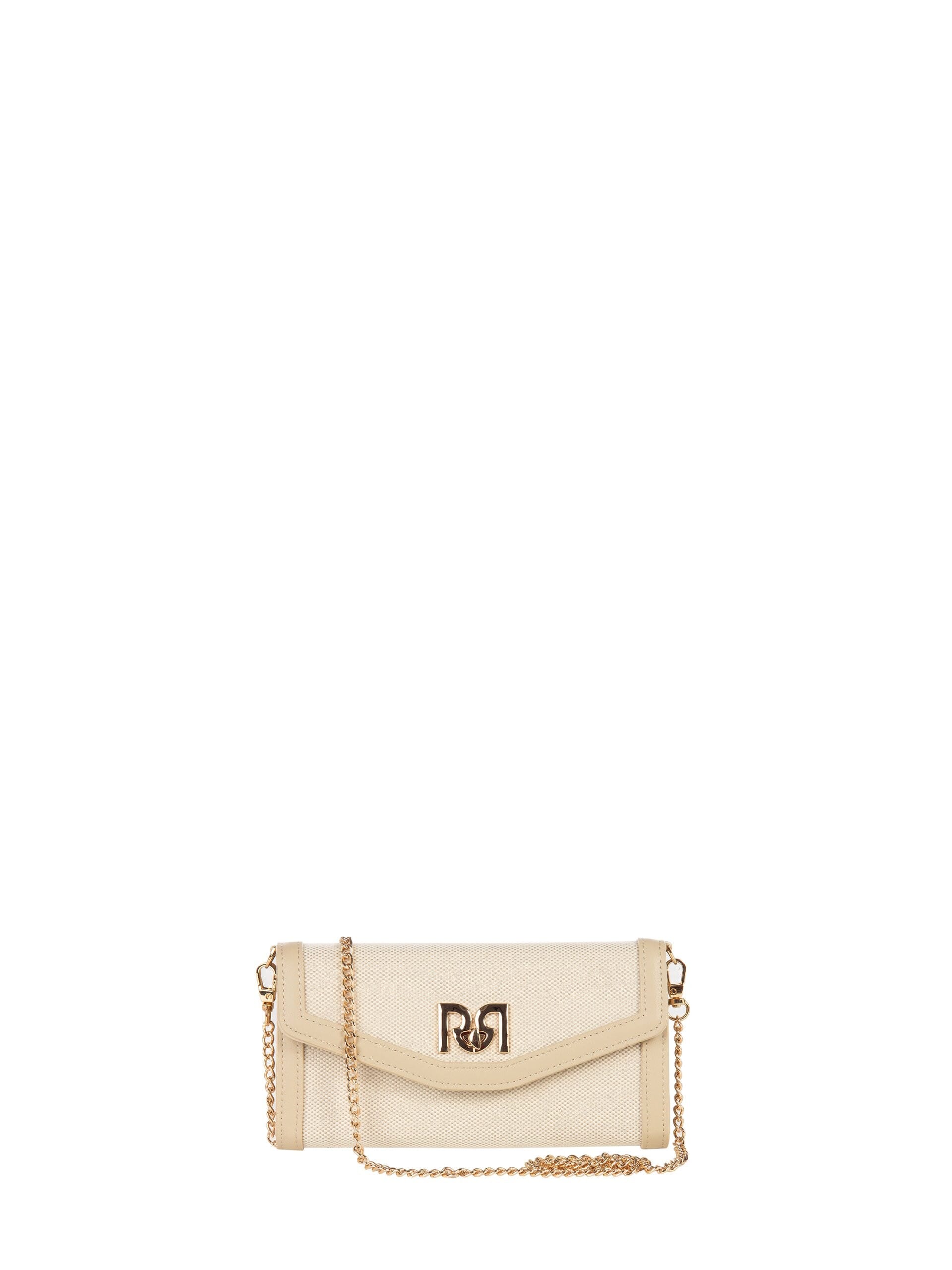 Portefeuille compact en toile structurée avec profils en similicuir souple, silhouette fine mais spacieuse. Rabat en forme avec logo en métal et sangle en chaîne amovible pour le porter également comme un mini sac. Parfait pour la journée au bureau et pour les apéritifs élégants.