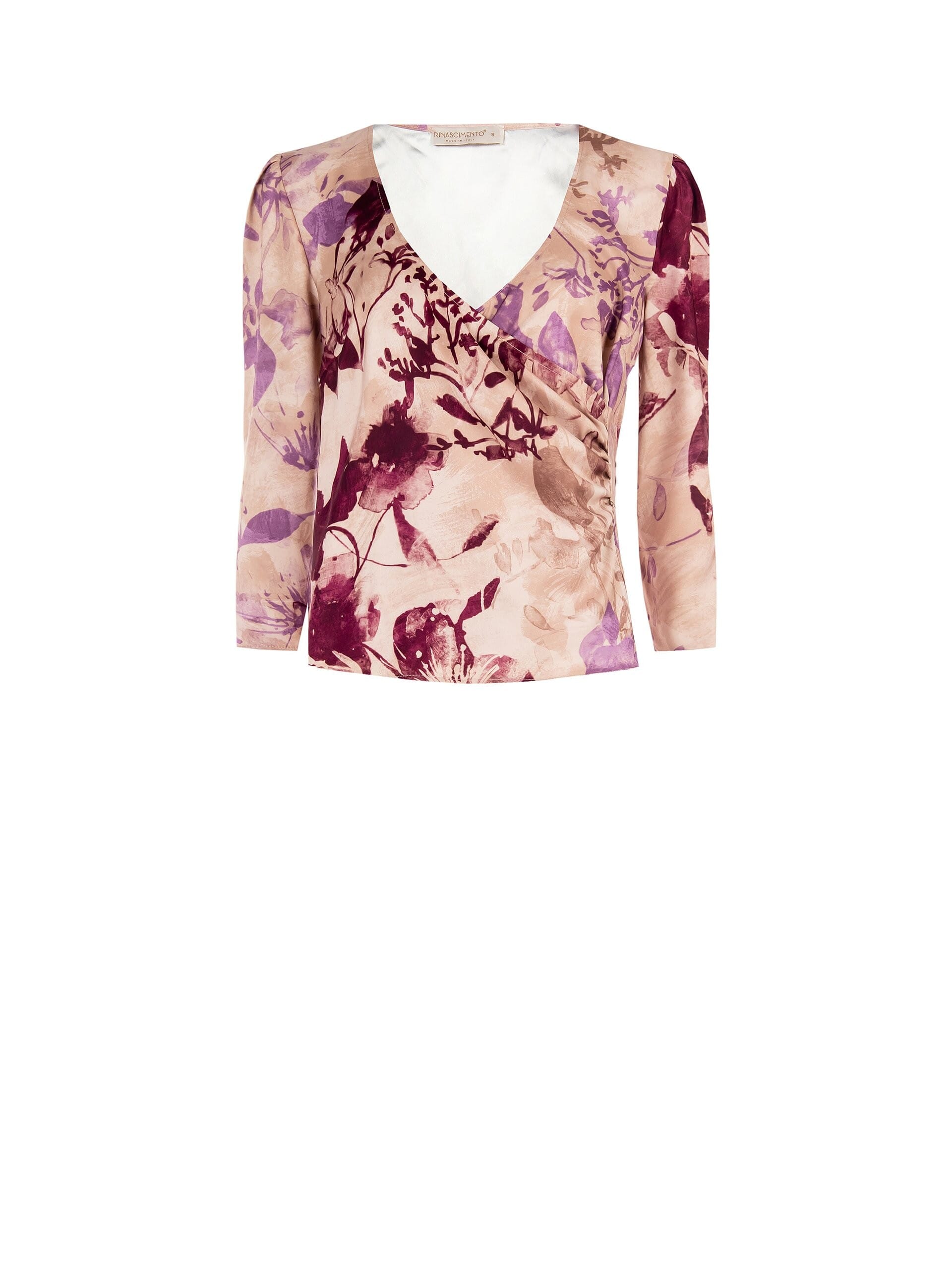 Top Rinascimento avec une coupe amincissante qui met en valeur la silhouette. En satin brillant à texture florale, doux sur la peau. Encolure en V croisée et fronces latérales qui définissent la taille. Parfait pour le bureau avec un blazer ou pour les cocktails et les dîners, grâce à sa polyvalence.
