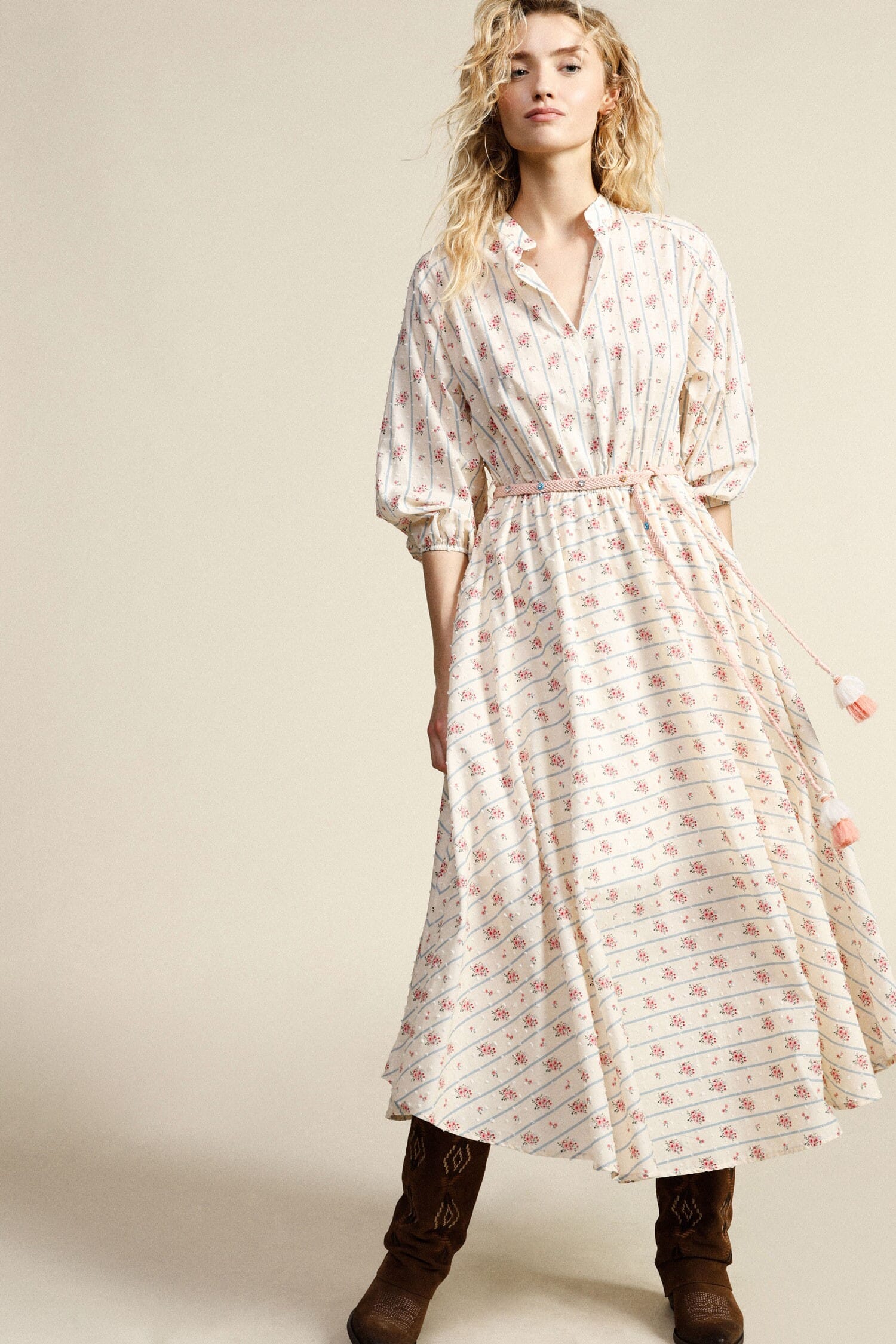 Laissez-vous séduire par cette robe longue au style romantique : l'imprimé fleuri et la légèreté des lignes en font un vêtement idéal pour exprimer la délicatesse sans sacrifier à la praticité. La taille est rehaussée par la ceinture tressée à pompons, tandis que les larges manches 3/4 donnent du mouvement et une coupe ample, parfaite pour votre journée.