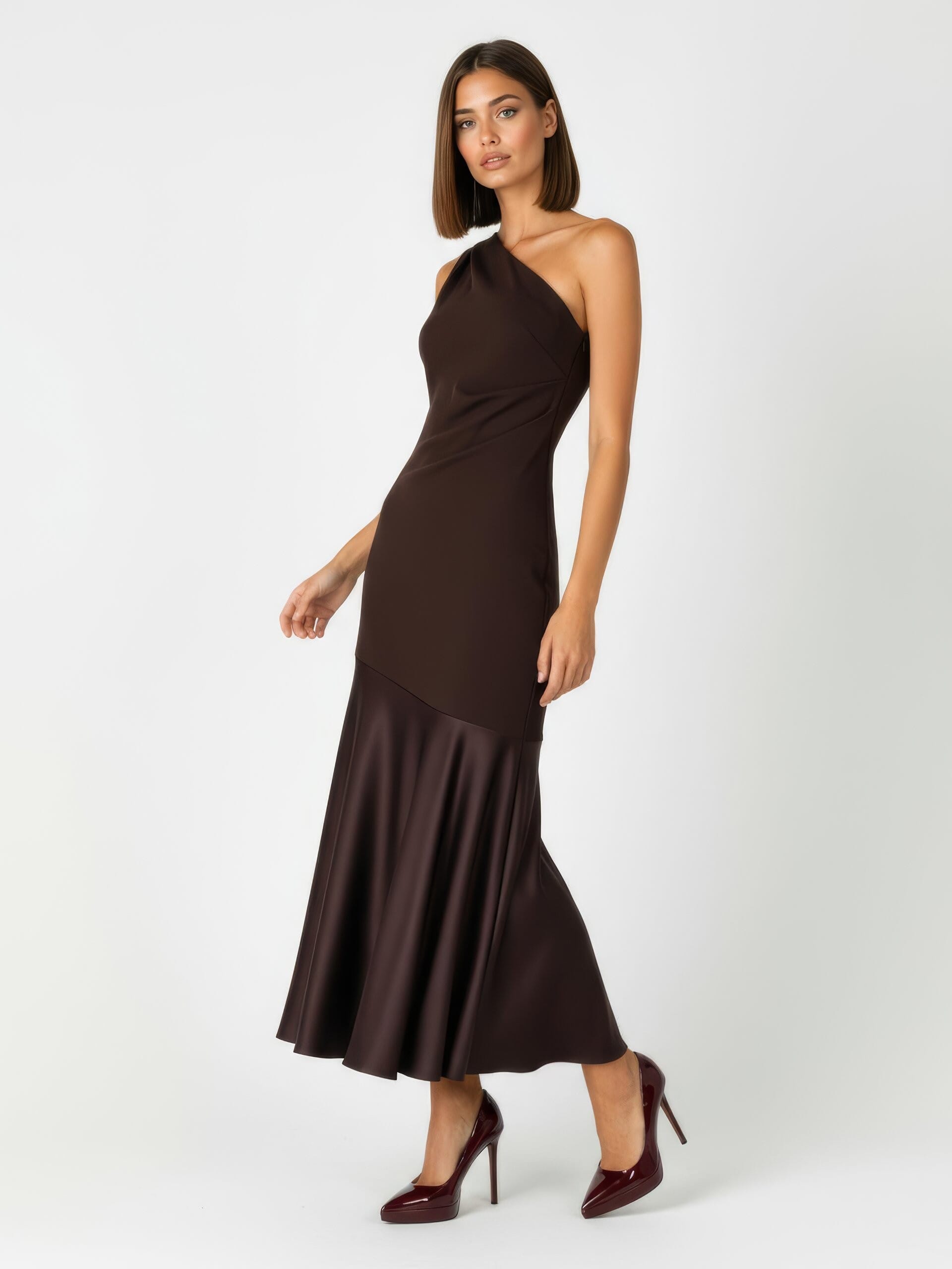 Rinascimento signe une longue longueur avec une coupe amincissante qui met en valeur la silhouette. Corsage en crêpe de scuba souple et enveloppant, jupe en satin fluide pour un mouvement sinueux. Épaule unique avec drapé et coupe diagonale qui amincit. Parfait pour les cérémonies, les fêtes et les dîners spéciaux.