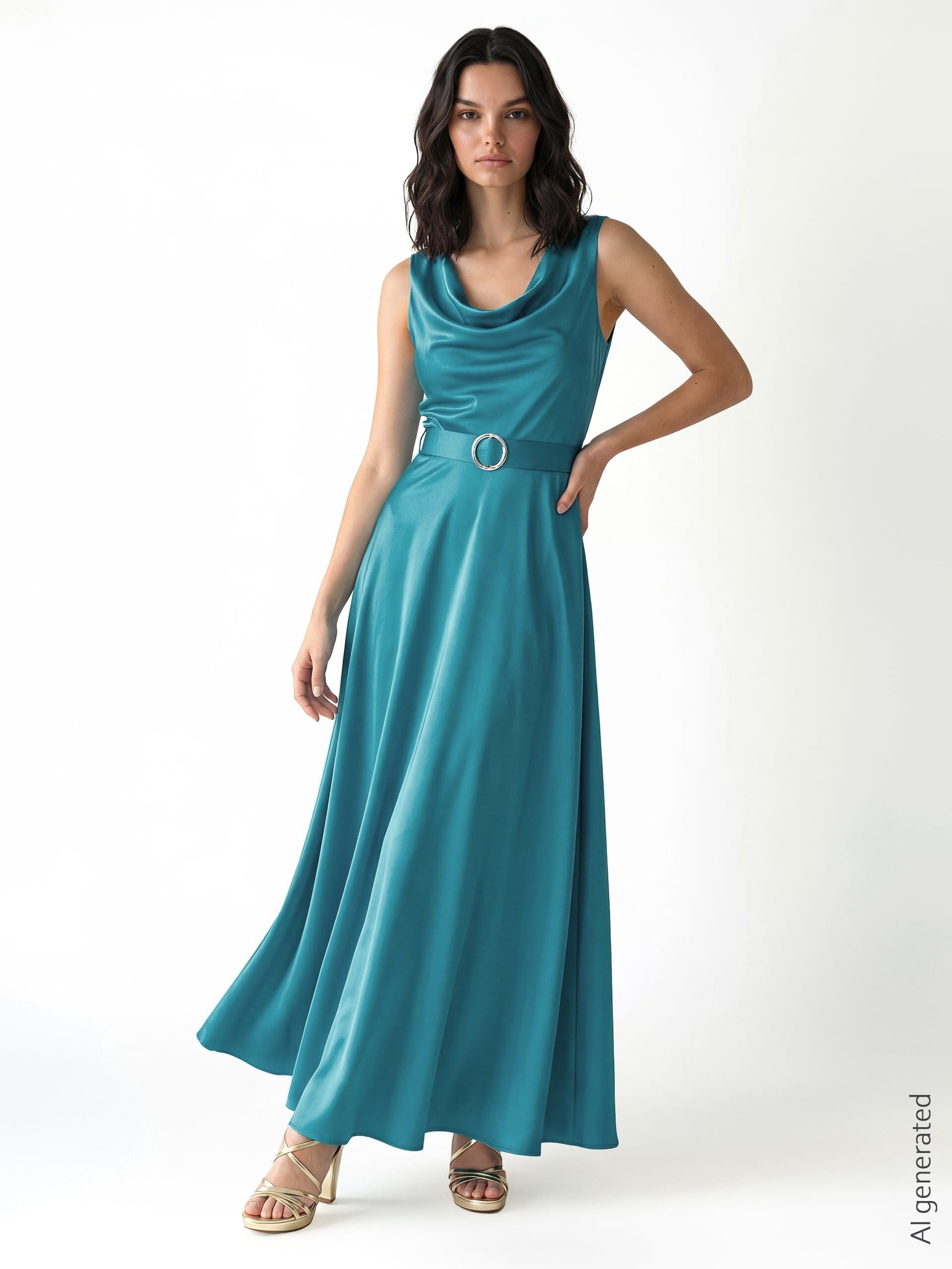 Robe longue Rinascimento à la ligne évasée qui épouse la taille et glisse doucement sur les hanches. Réalisée en satin brillant, elle met en valeur le décolleté grâce à sa douce encolure en cascade. Parfaite pour les cérémonies, les cocktails et les soirées spéciales.