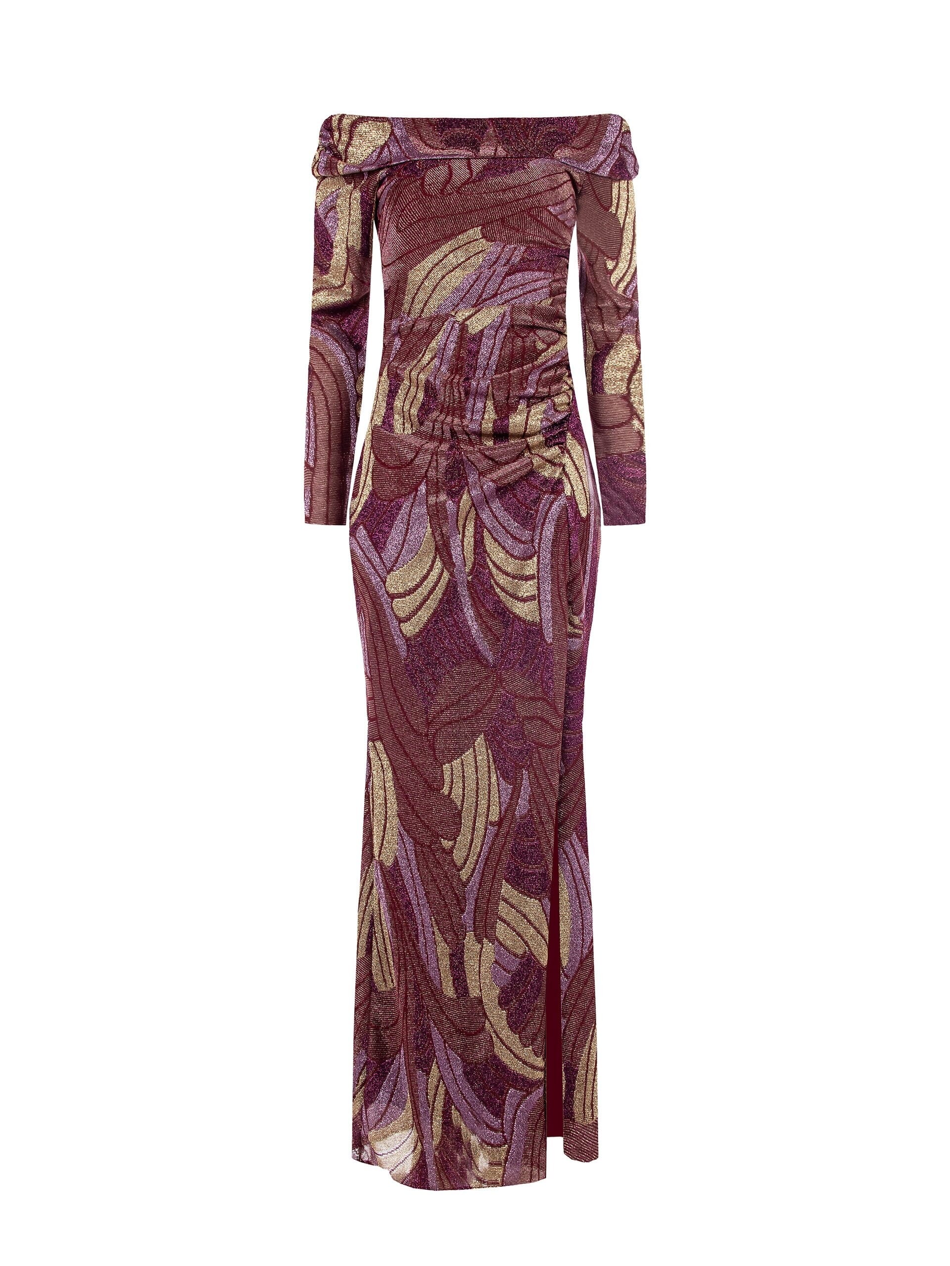 Rinascimento signe une longueur sirène, ajustée mais confortable grâce au jersey lumineux effet lurex. L'encolure décolletée souligne le décolleté, les légers volants sur le côté sculptent la silhouette ; la fente sur le devant assure la liberté de mouvement. Parfait pour les fêtes, les dîners et les tapis rouges.