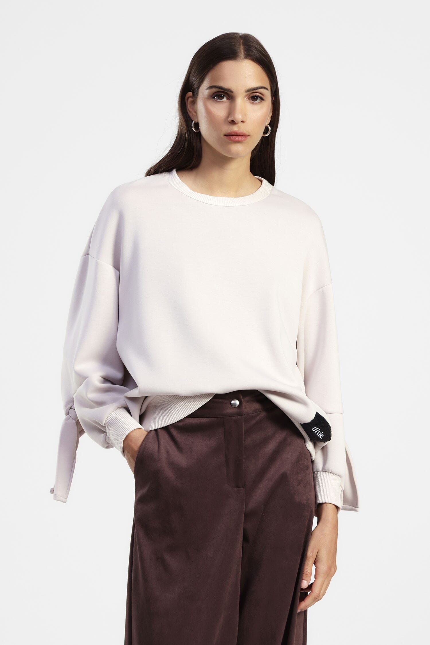 Imaginez porter un sweat à la coupe décontractée, enrichi de manches longues avec détail de nœud aux poignets et d'un patch visible en bas. Idéal pour celles qui recherchent confort et originalité au quotidien, il apporte une touche unique à vos looks décontractés sans sacrifier le souci du détail.
