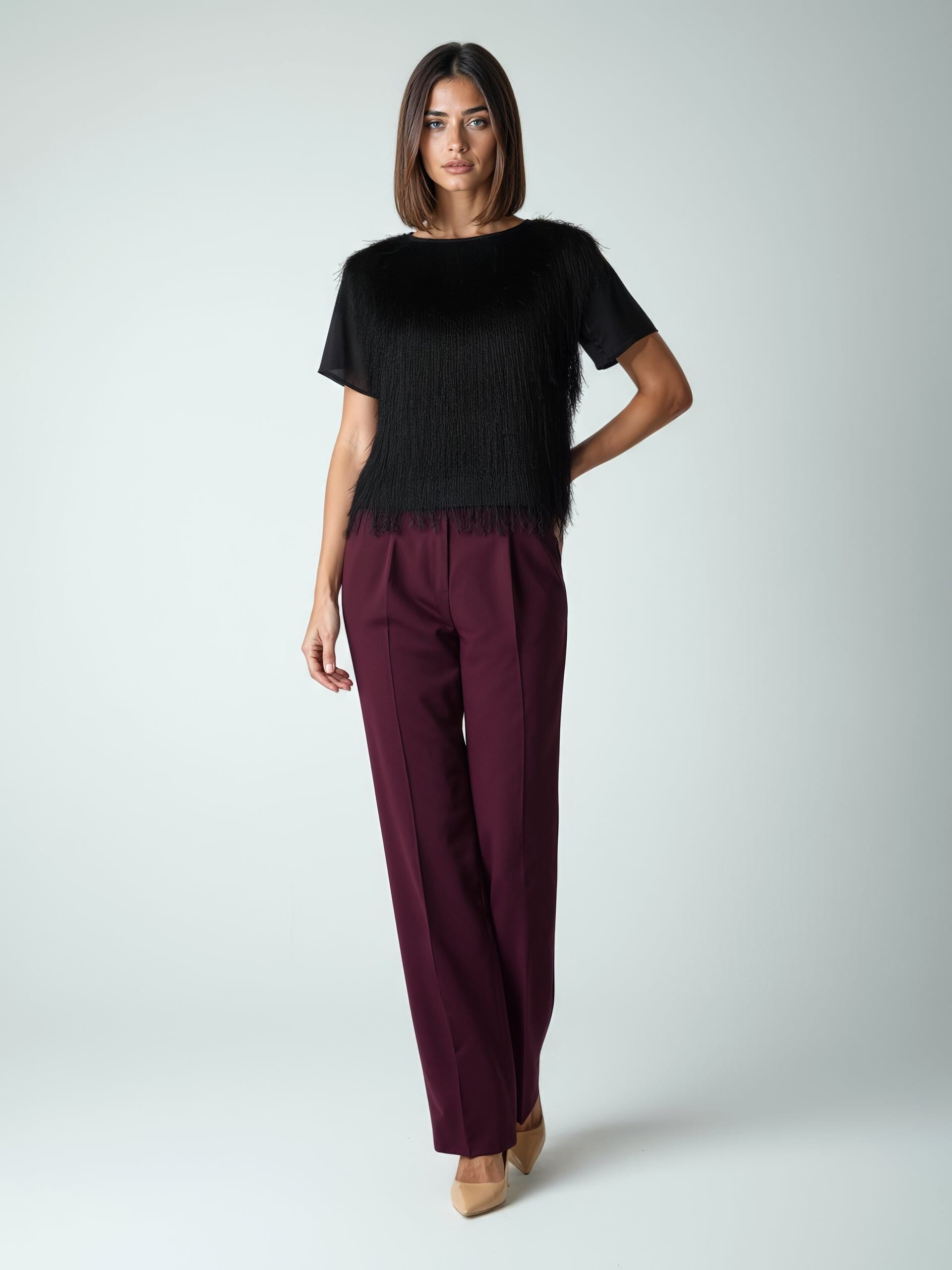 Rinascimento signe un top fluide à la coupe souple qui glisse sans marquer. Devant en georgette frangée pour un mouvement spectaculaire, manches légères et encolure ronde pour équilibrer la silhouette. Confortable pour la journée, parfait pour l'after-work et les soirées : rehaussez vos jeans, tailleurs ou jupes d'un geste.