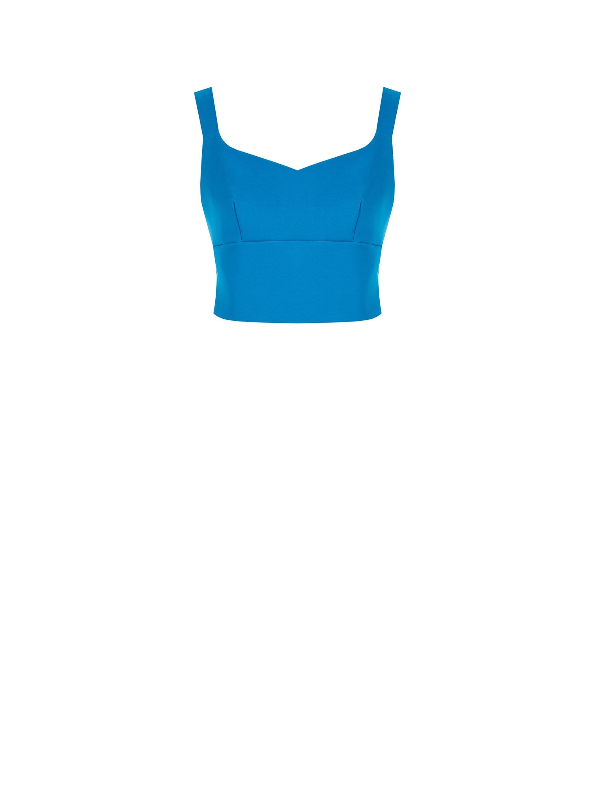 Rinascimento crop près du corps en tissu technique légèrement extensible : suit les lignes sans serrer et définit la taille. Encolure en cœur avec larges bretelles, découpes sous la poitrine et pinces qui mettent en valeur le décolleté. Parfait avec un blazer et un pantalon pour le bureau, ou avec une jupe taille haute pour les cocktails et les soirées.