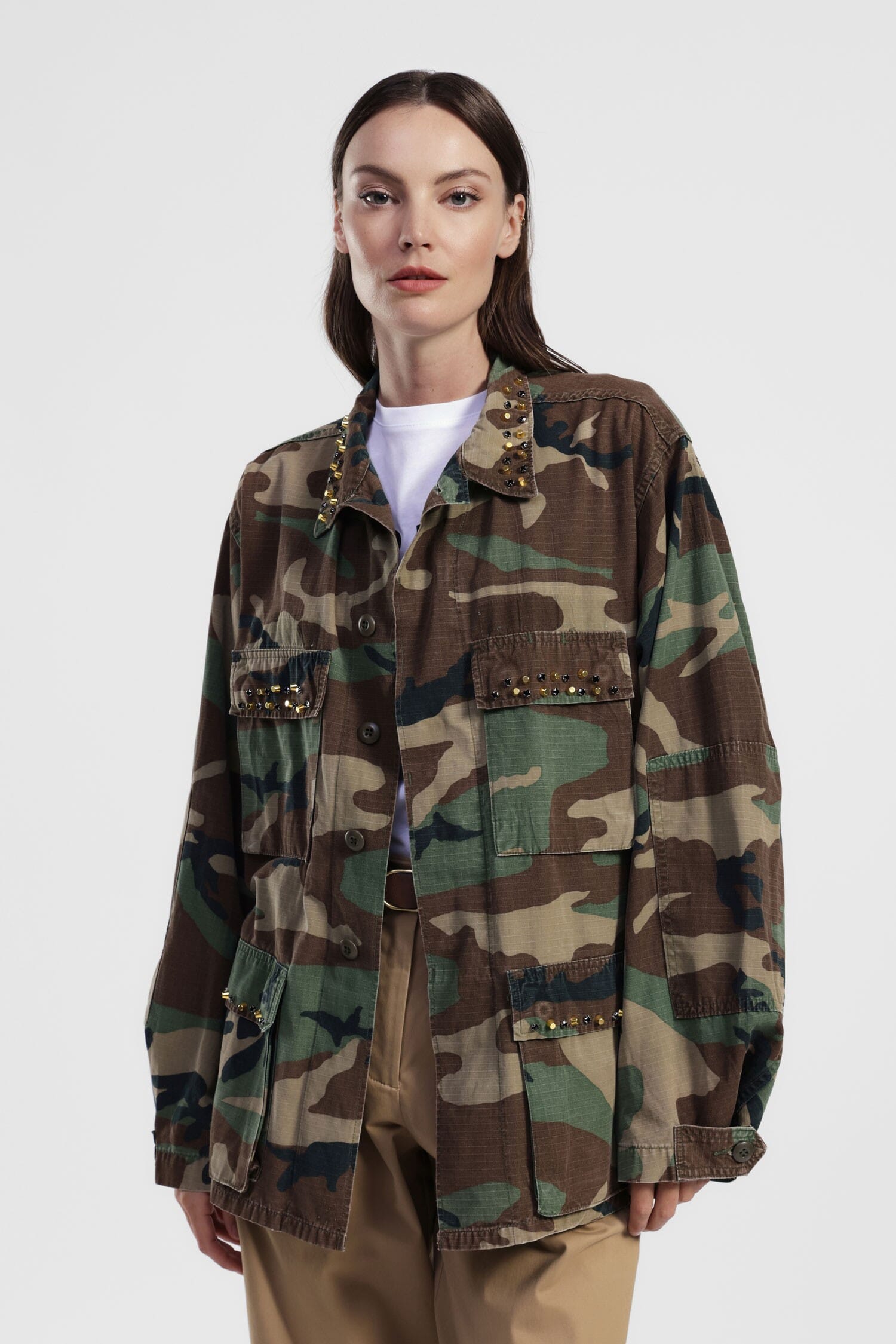 Parfaite pour ceux qui aiment s'habiller avec caractère, cette veste chemise à coupe droite rehausse le look de tous les jours avec son motif camouflage et ses clous décoratifs sur le col et les poches. Les quatre grandes poches avant permettent de garder tout à portée de main. Imaginez la porter sur une tenue décontractée pour vous démarquer avec des détails originaux.