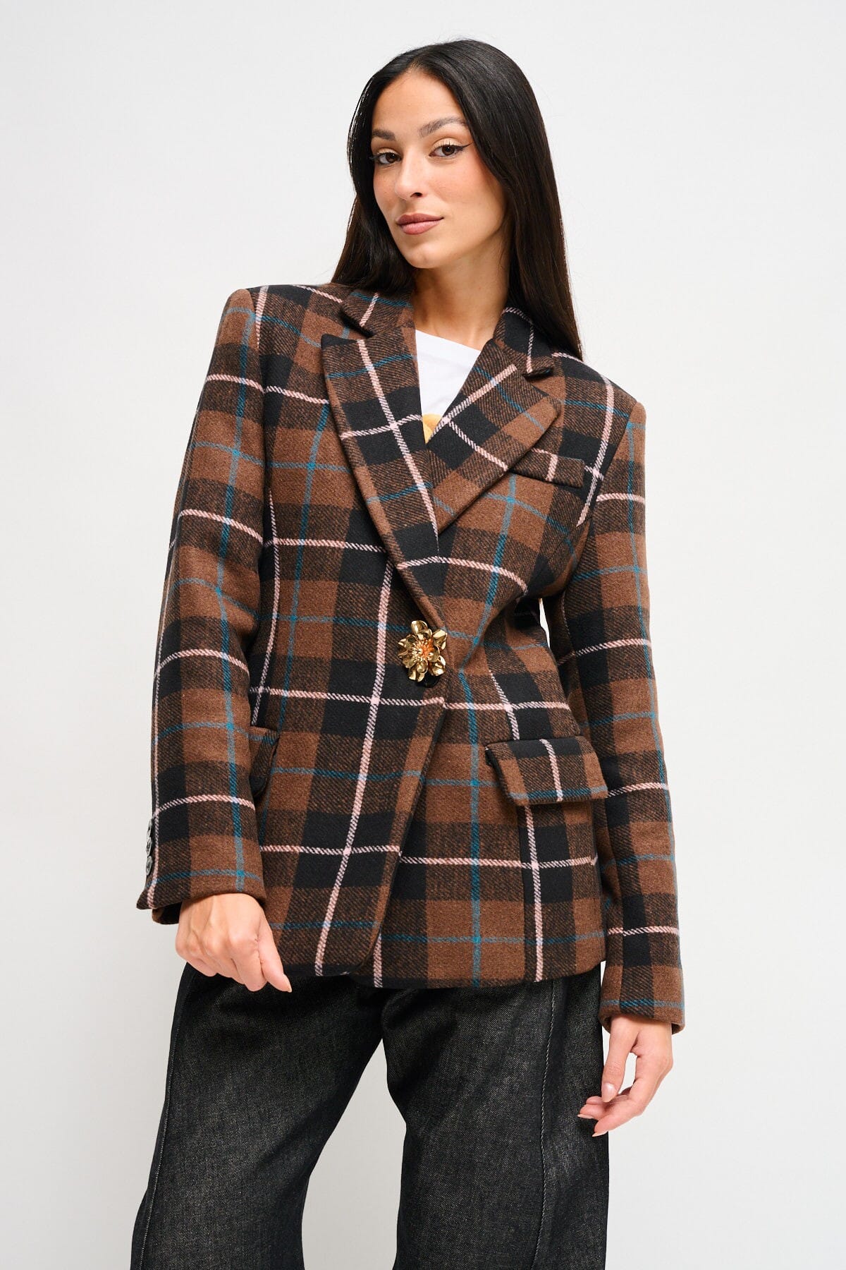 Maryley signe une veste droite légèrement structurée en tissu doux à carreaux pour la chaleur et le confort. Des revers classiques, des poches à rabat et une broche bijou amovible qui définit la taille. Polyvalente du bureau à l'apéritif, elle rehausse les jeans et complète les looks plus formels.
