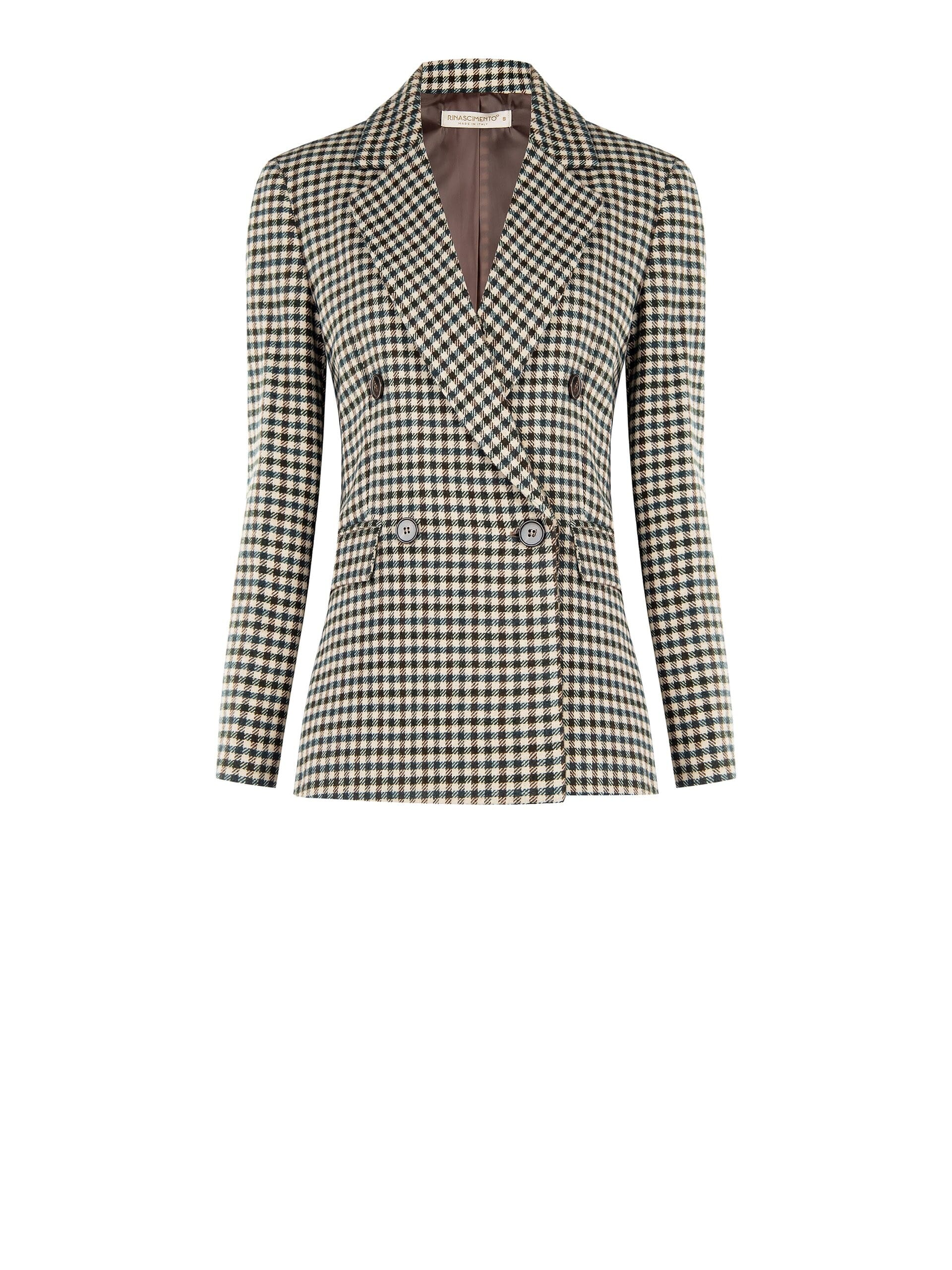Blazer Rinascimento avec une coupe ajustée qui affine la silhouette. Tissu souple et structuré avec micro pied-de-poule, doublé pour un confort impeccable. Double boutonnage avec revers en pointe et poches à rabat : des détails qui font la différence. Parfait pour le bureau et pour rehausser le quotidien d'une touche sophistiquée.