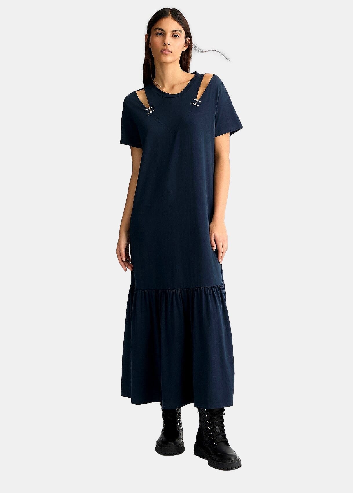 Abito lungo in jersey di cotone stretch,motivi cut-out con dettagli in metallo,scollo rotondo,maniche corte,cintura elastica con fibbia logata in metallo,balza al fondo,ecosostenibile.