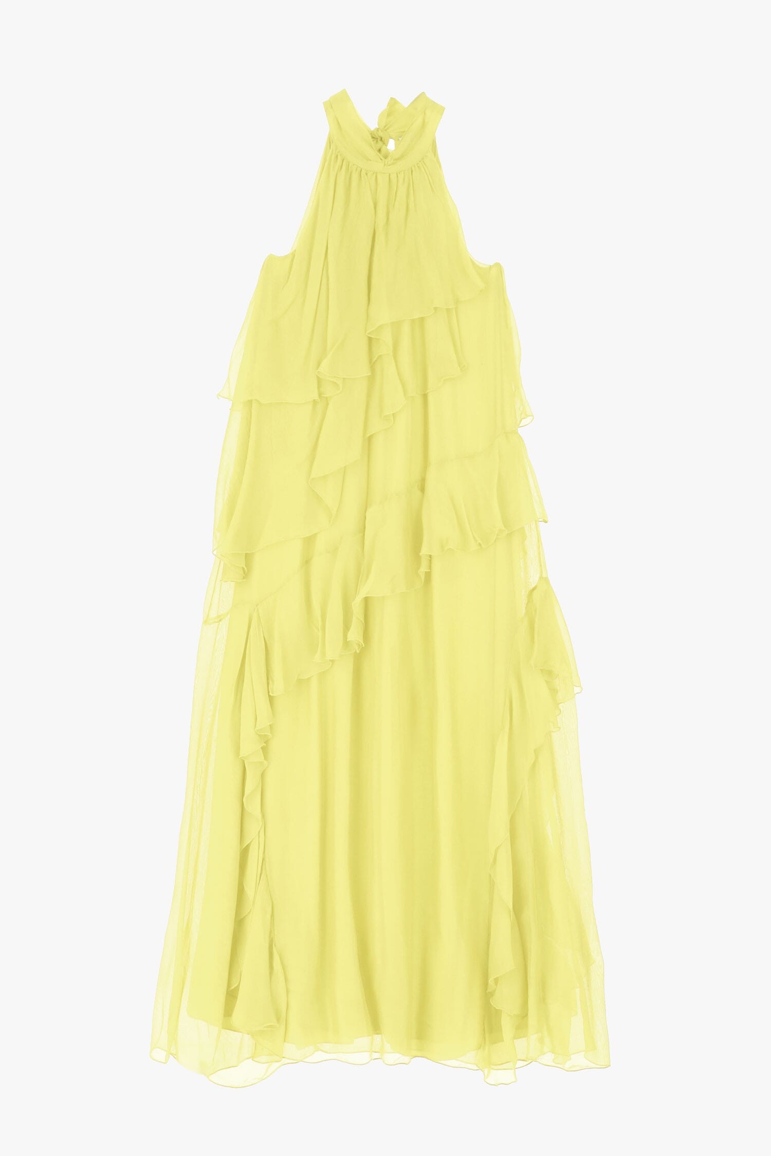 Risveglia il tuo fascino con questo abito lungo caratterizzato da una cascata di volant. Il design fluido e senza maniche crea un'aura che cattura l'essenza della femminilità. Il collo alto aggiunge un tocco di sofisticatezza, perfetto per una serata speciale o un evento estivo.