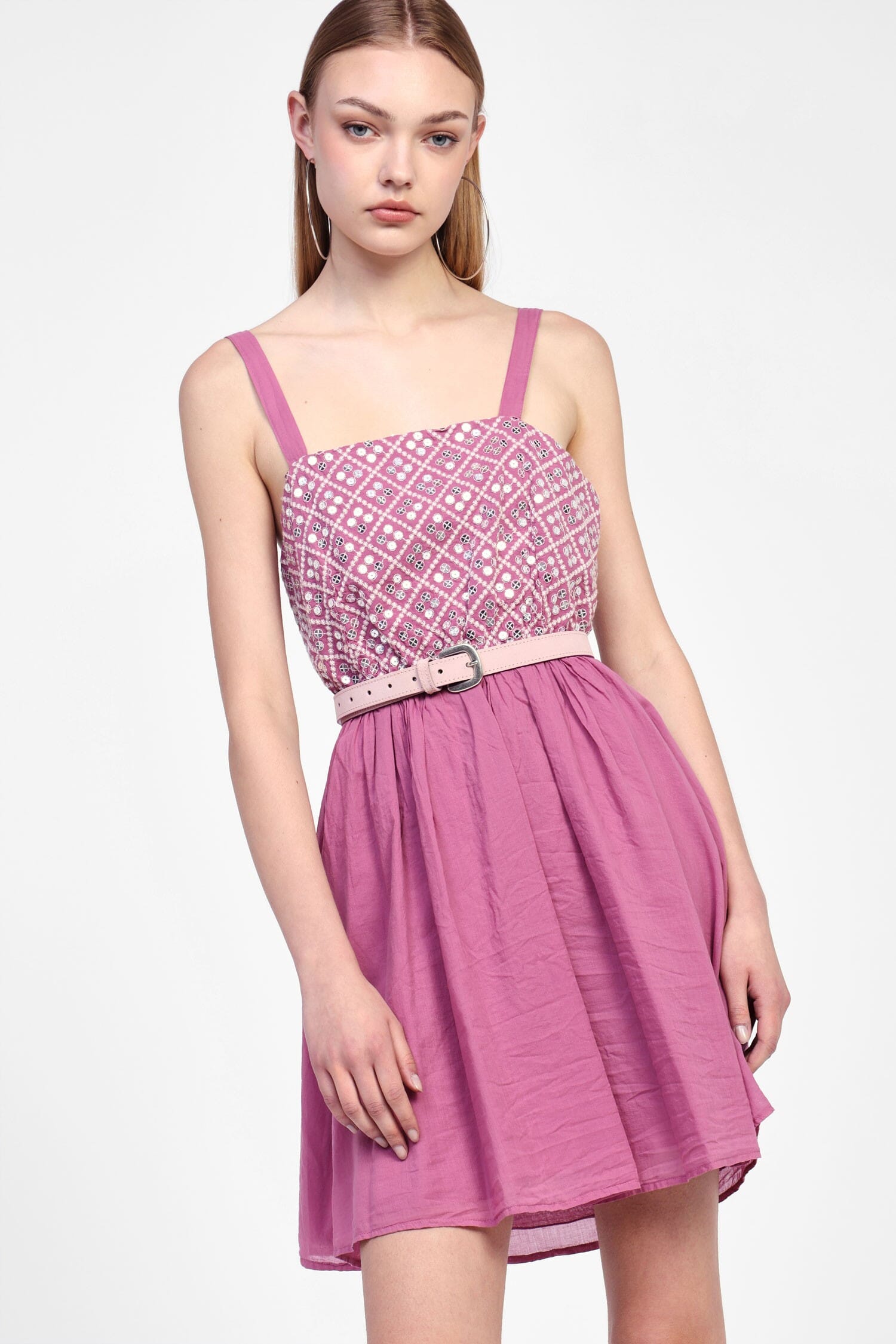 Un abito leggero e arioso, perfetto per le giornate di sole. Il design con spalline e scollatura quadrata offre un tocco di femminilità e freschezza. Il motivo stampato dona un carattere vivace, mentre il taglio corto garantisce libertà di movimento. Indossalo per esplorare la città o per una passeggiata al parco.