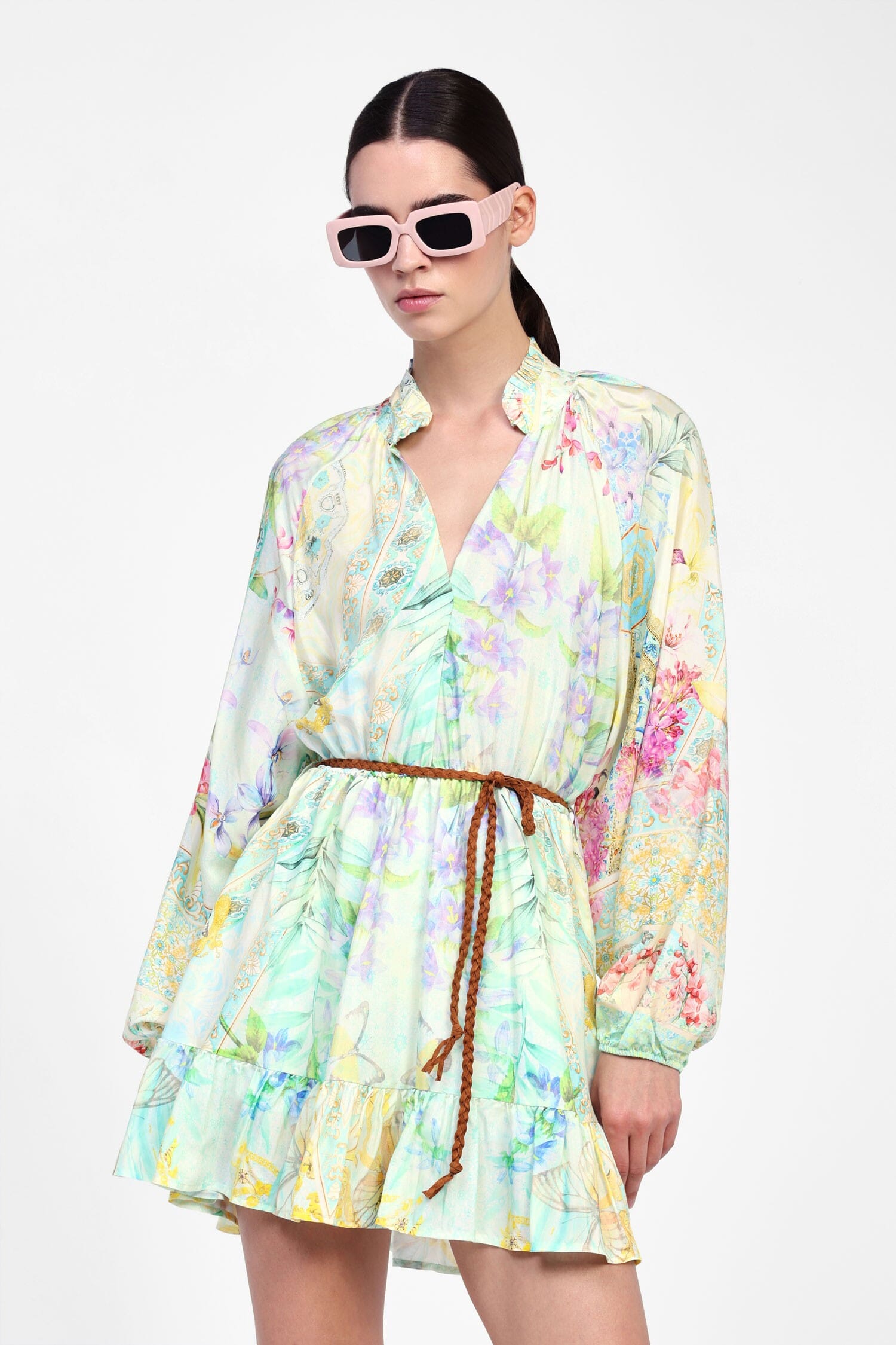 Un abito che abbraccia la femminilità con una stampa di ispirazione floreale. Le maniche ampie e la cintura in vita aggiungono una dimensione di praticità, mentre il taglio corto conferisce una leggerezza senza pari. Ideale per chi desidera unire comfort e uno stile originale, perfetto per una quotidianità raffinata e fresca.