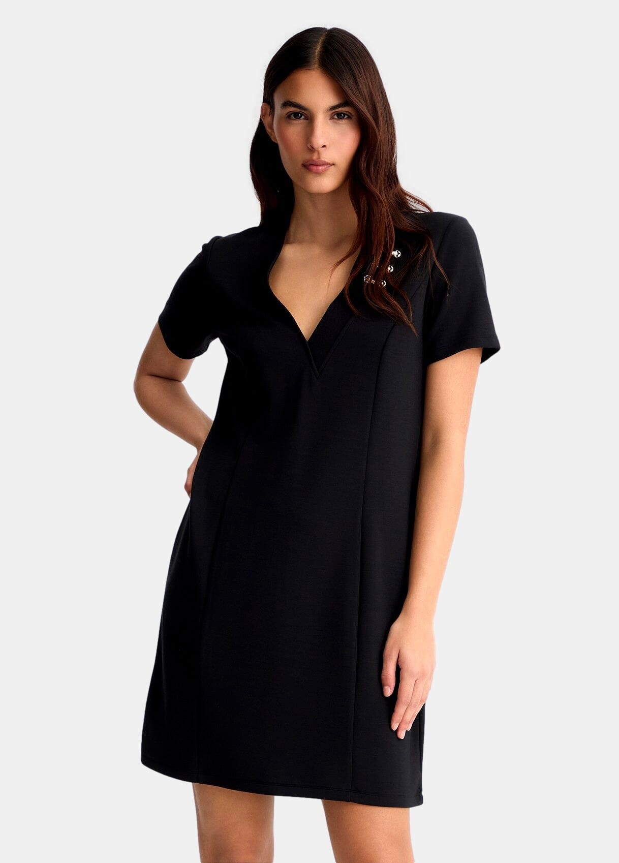 Abito corto in scuba stretch,motivo cut-out con dettagli gioiello,scollo a V,maniche corte.