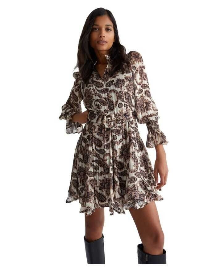 Abito fantasia astratta,maniche lunghe a palloncino con polsi a volant,collo alto alla coreana.