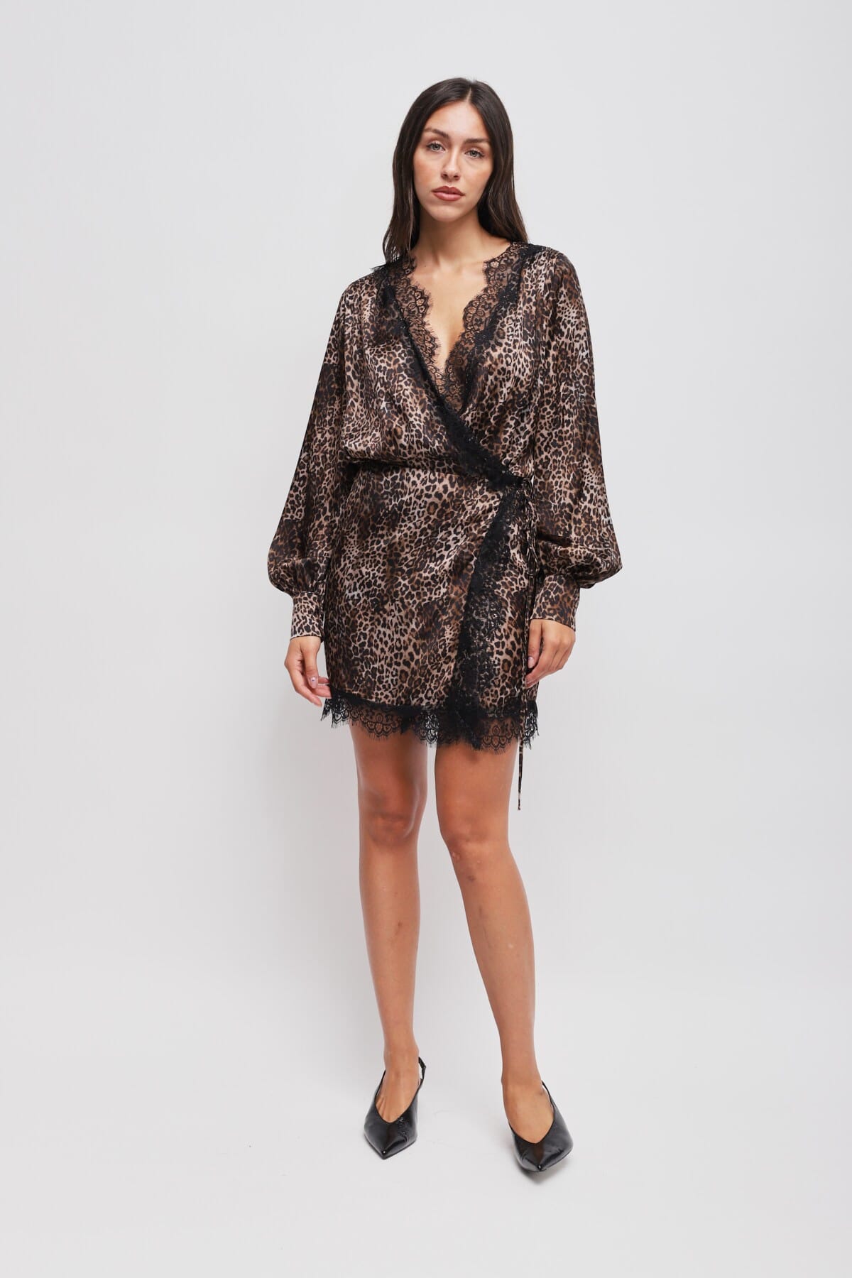 Mini abito a portafoglio in tessuto satinato con stampa leopardata. Caratterizzato da scollo a V e orlo rifiniti con pizzo nero. Ideale per serate ed eventi speciali.